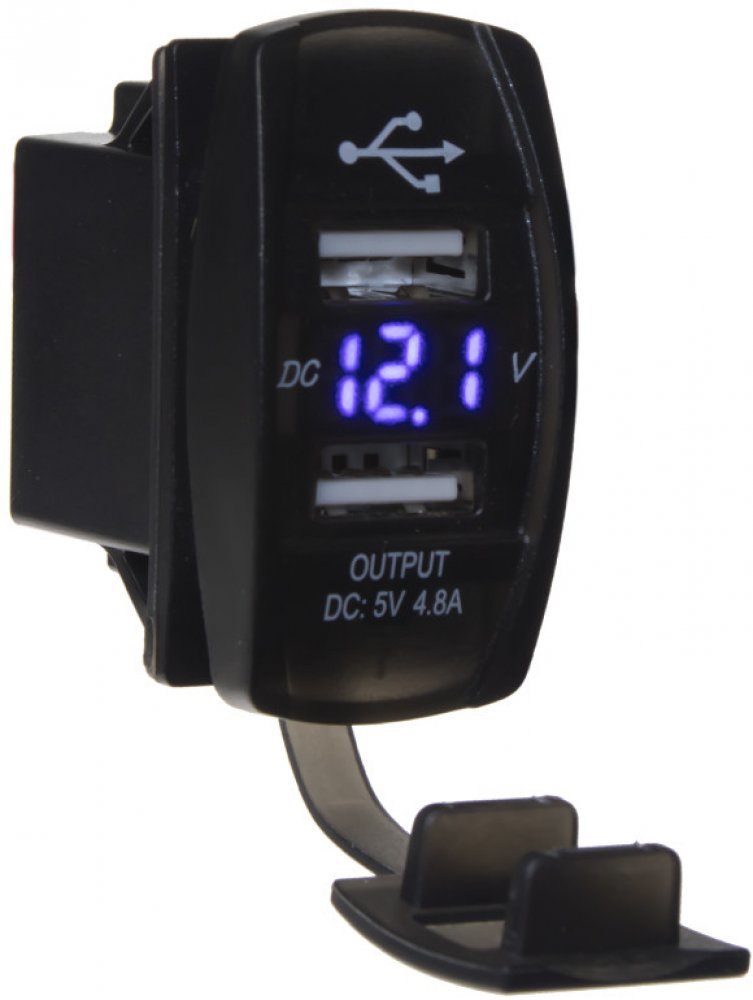 2x USB nabíječka s voltmetrem v provedení ROCKER, s krytkou proti prachu a vlhkosti, modrý LED displej.