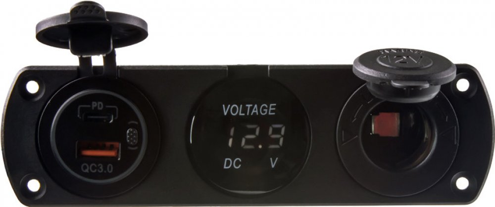 Trojitá zásuvka do panelu s voltmetrem, CL, 1x USB-A, 1x USB-C, nabíječka voděodolná.