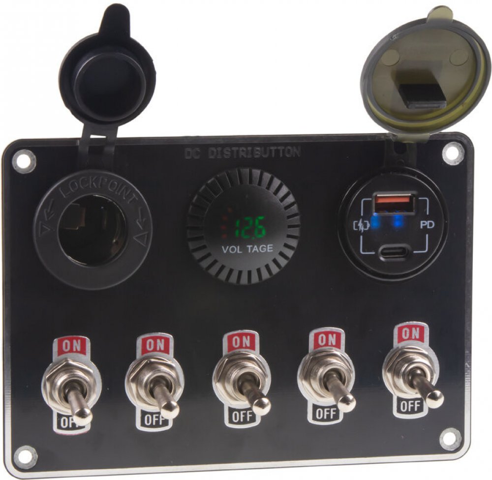 Univerzální panel s 5x spínačem, 2x USB, voltmetrem a CL zásuvkou.