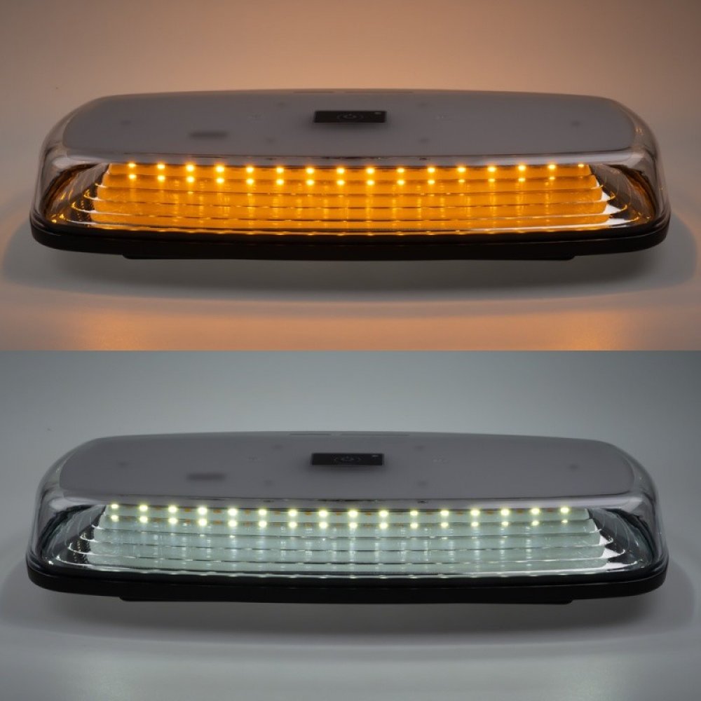 Akumulátorová nabíjecí miniaturní výstražná oranžovo/bílá LED světelná rampa s deseti režimy blikání. Rampa umí blikat oranžovou, bílou, oranžovou a bílou barvou dohromady nebo střídavě oranžovo/bíle. Určena pro uchycení pomocí magnetu.
