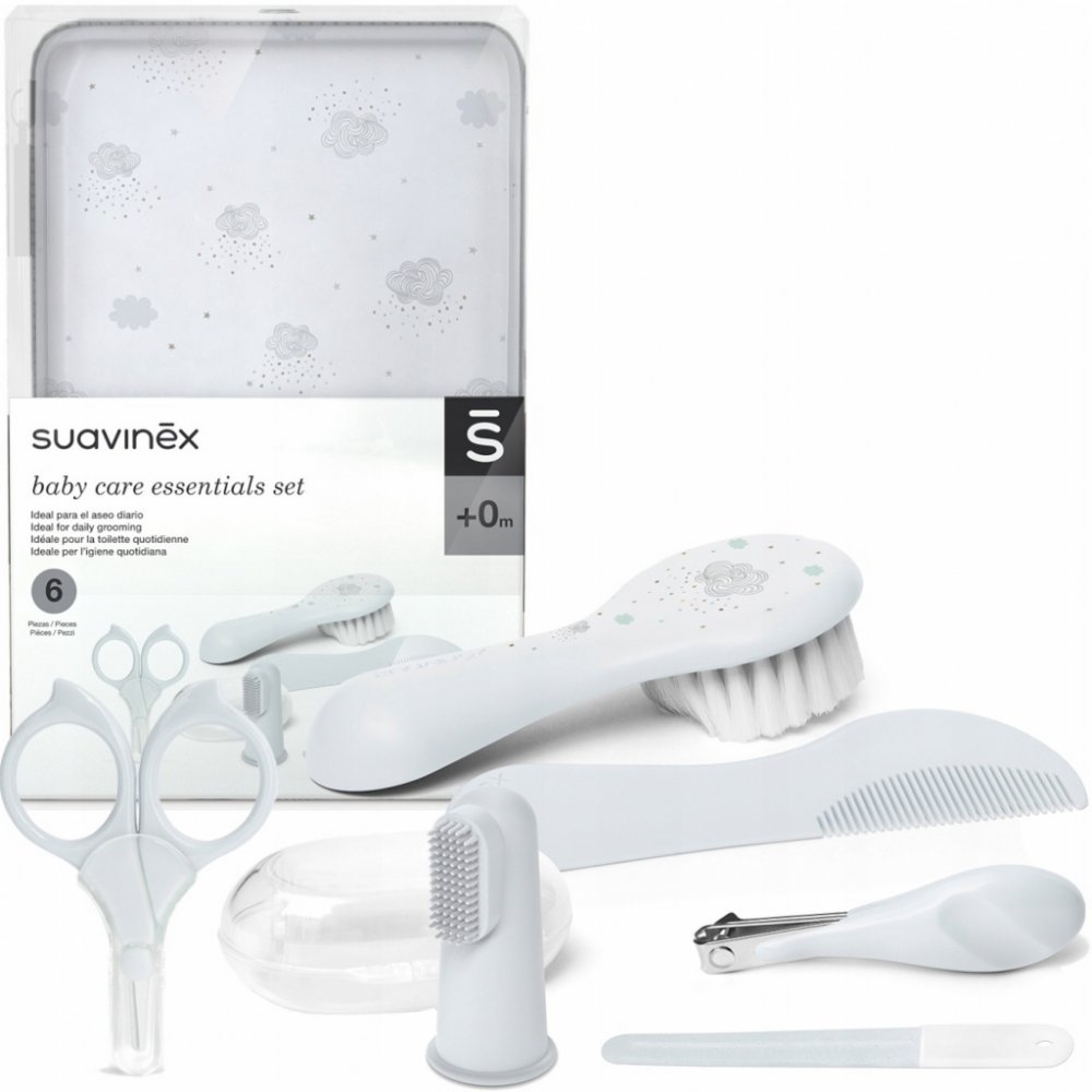 Sada Suavinex představuje komplexní řešení pro každodenní péči o miminko. Sada obsahuje 6 nezbytných doplňků: nůžky se zaoblenými konci, pilník, kleštičky na nehty, kartáč a hřeben na první chloupky a silikonový kartáček na zuby.