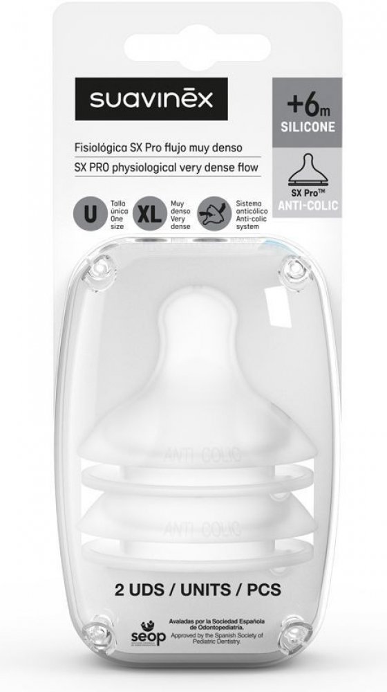 Savičky Suavinex se přizpůsobují potřebám miminka ve všech etapách jeho růstu. Nabídněte si z možností vybrat si velikost savičky dle věku dítěte (S1 - mladší děti, S2 - starší děti a UNIverzální velikost - pouze orientační označení, každé dítě má jiný sací reflex) a tvar - anatomickou nebo kulatou savičku.