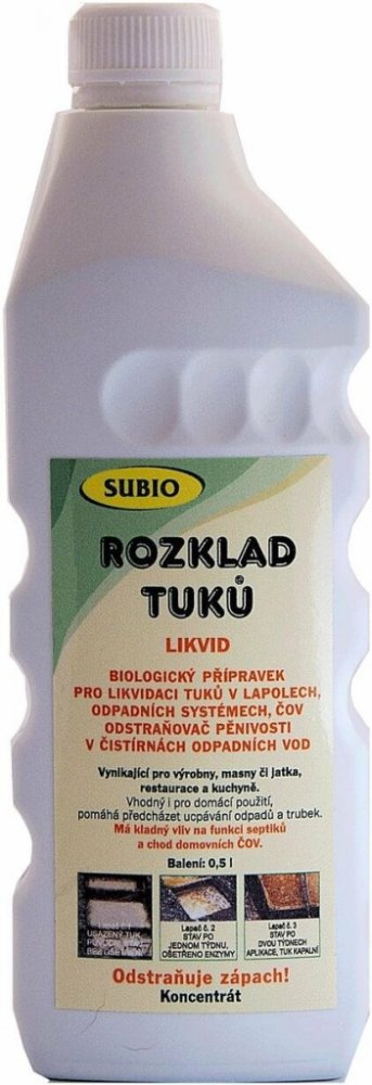 Eko čisticí prostředek SUBIO Rozklad tuků Likvid je vysoce účinný enzymatický přípravek s koncentrací enzymů, jako jsou lypáza, proteáza a amyláza, které umožňují rychlé a efektivní štěpení tuků na biologicky odbouratelné složky. Eko čisticí prostředek SUBIO je biologický čistič, ideální pro uvolňování ucpaného potrubí, čištění odlučovačů tuků, toaletních mís, pisoárů, suchých WC a odmašťování pov...