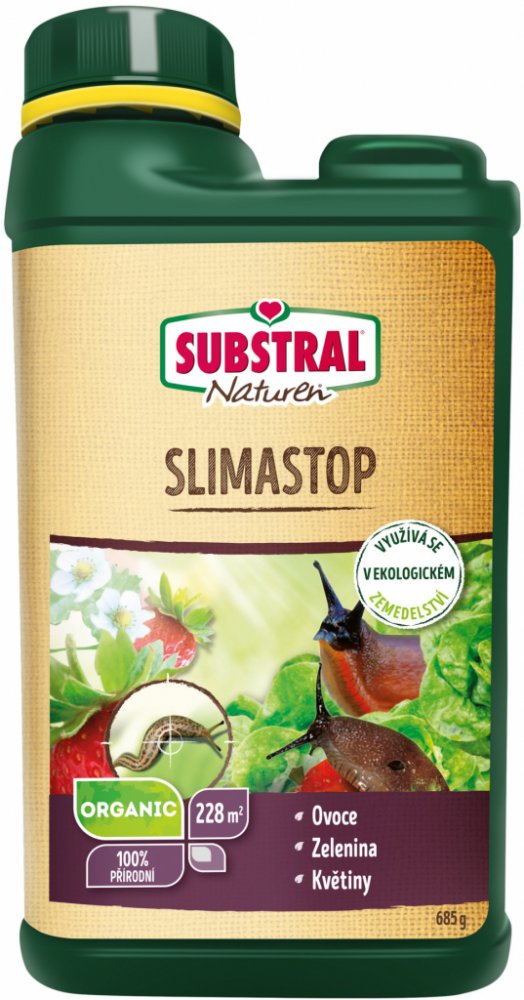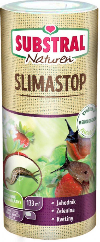 Substral Slimastop ve formě granulované návnady je muloskocidní přípravek s účinnou látkou na přírodní bázi, určený na ochranu jahodníku, salátu, košťálové zeleniny i okrasných rostlin před poškozováním slimáky, plzáky a hlemýždovitými v záhonech i ve sklenících. Působí jako požerová návnada. Způsob působení: Slimáci žerou granule namísto rostlin. Posléze se dostaví pocit sytosti a slimáci se uchýlí do úkrytů, kdy hynou. Aplikace: Přípravek aplikujte opatrným a rovnoměrným rozhozem granulí na půdu kolem rostlin, které chcete chránit. Ujistěte se, že žádná granule neulpěla přímo na rostlinách nebo na jejich listech. Aplikujte na vlhkou půdu, nikoliv do mokra. Je-li to nutné, opakujte aplikaci po 14 dnech, ale maximálně 4x za sezónu. Po aplikaci se několik dnů zdržte intenzivního zalévání. Přípravek se rovnoměrně rozsype ve vzdálenosti 8 - 10 cm mezi jednotlivými granulemi kolem rostlin při prvním výskytu slimáků nebo při zjištění jejich požerků. Aplikaci rozhozem provádějte nejlépe večer a vždy za suchého počasí. S přípravkem manipulujte tak, aby se minimalizovala prašnost. Vlastnosti: - Účinná látka: fosforečnan železitý 10 g/kg (tj. 1 % hmotnosti) - Základní dávka: 3 g/m2 - Balení vystačí na cca 228 m2.