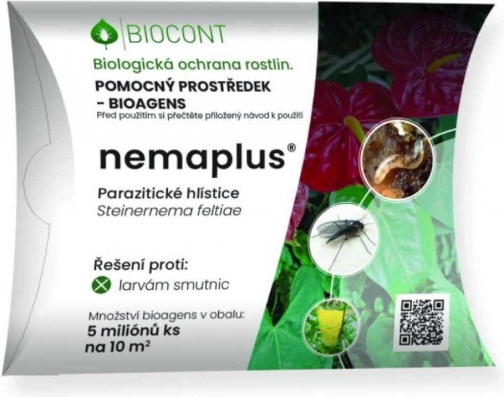 Nemaplus je biologický přípravek obsahující parazitické hlístice rodu Steinernema feltiae, které likvidují larvy smutnic v půdě. Ideální je použití ve fázi výskytu larev – doma po celý rok, venku hlavně na jaře a na podzim.