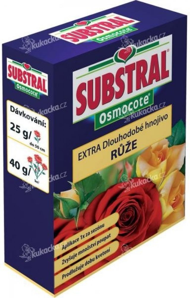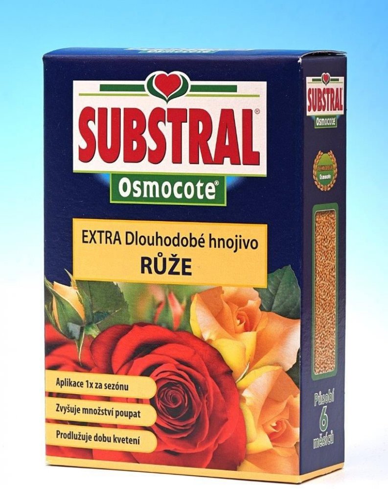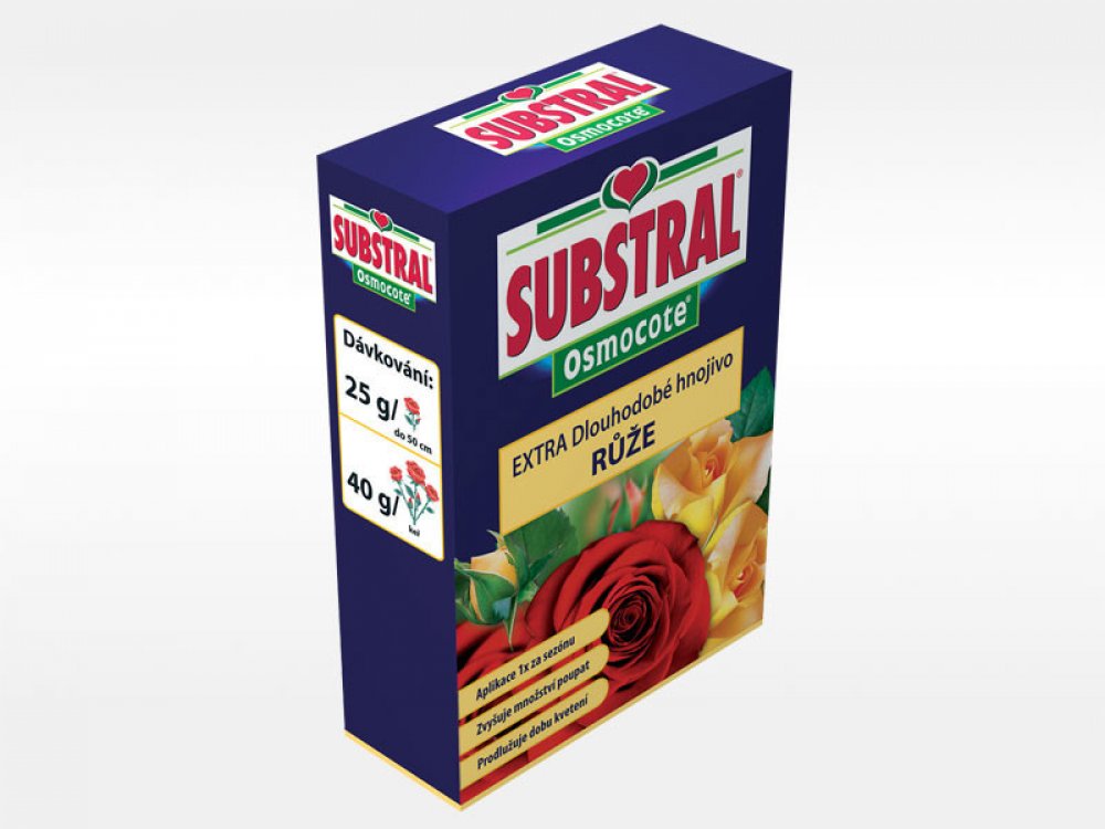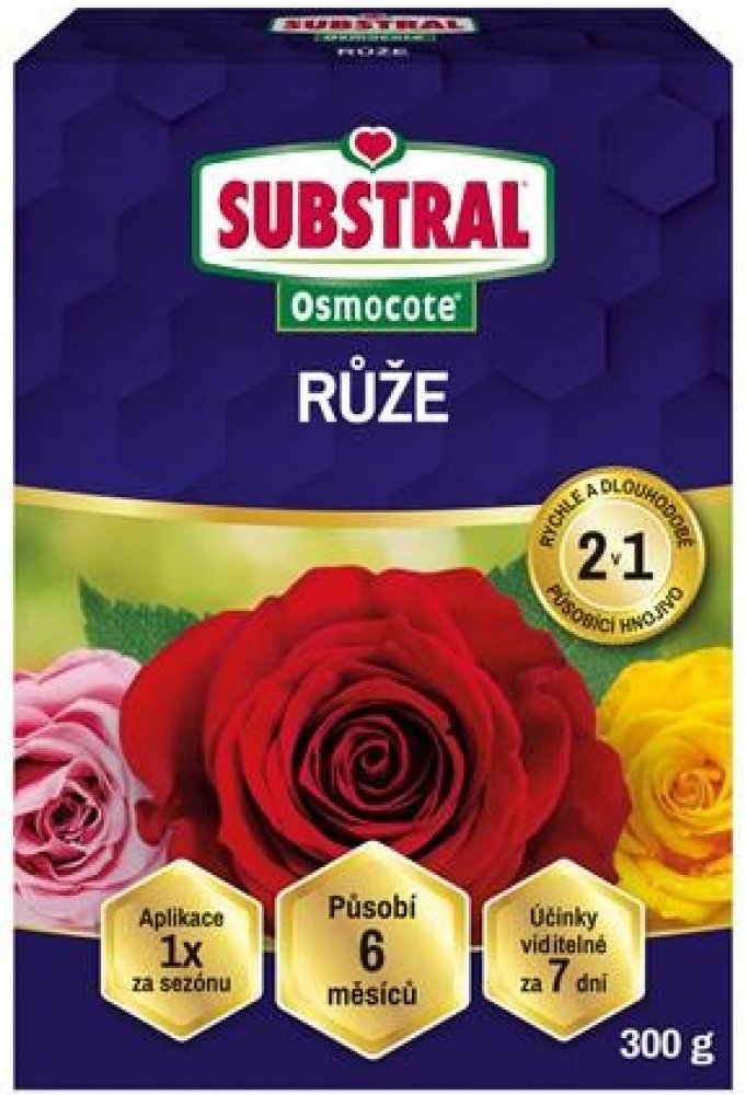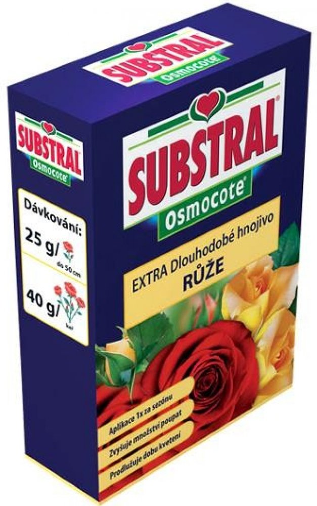 Substral Osmocote 2v1 je hnojivo s postupným uvolňováním živin. Každá granule je obalena vrstvou speciální rostlinné pryskyřice, v půdě dochází k narušení tohoto obalu vodou, která proniká do granule a postupně uvolňuje živiny ve formě přijatelné pro rostliny. Hnojíme tedy jen jednou za sezónu. Hnojivo uvolňuje živiny cca 6 měsíců. Rychlost uvolňování živin je ovlivněna teplotou půdy. při 16°C vydrží 6-7 měsíců při 21°C vydrží 5-6 měsíců při 26°C vydrží 4-5 měsíců Rovnoměrný a stálý přísun živin podle nároků rostlin. Nedochází ke kolísání množství živin. Je vyloučené předávkování živin i jejich vyplavování Jsou výhodné z hlediska ochrany životního prostředí, snižuje se nebezpečí znečištění povrchových i podzemních vod. Používáním těchto hnojiv je možné snížit riziko znečištění dusíkatými látkami až o 80% Vyšší počáteční náklady se vrátí ve formě vyšších výnosů i úsporou práce. růže - výsadba 20g/keř starší rostlina 60g/keř Aplikujte na jaře nebo začátek léta Aby hnojivo mohlo začít působit, je třeba rostliny po jeho aplikaci důkladně zalít.