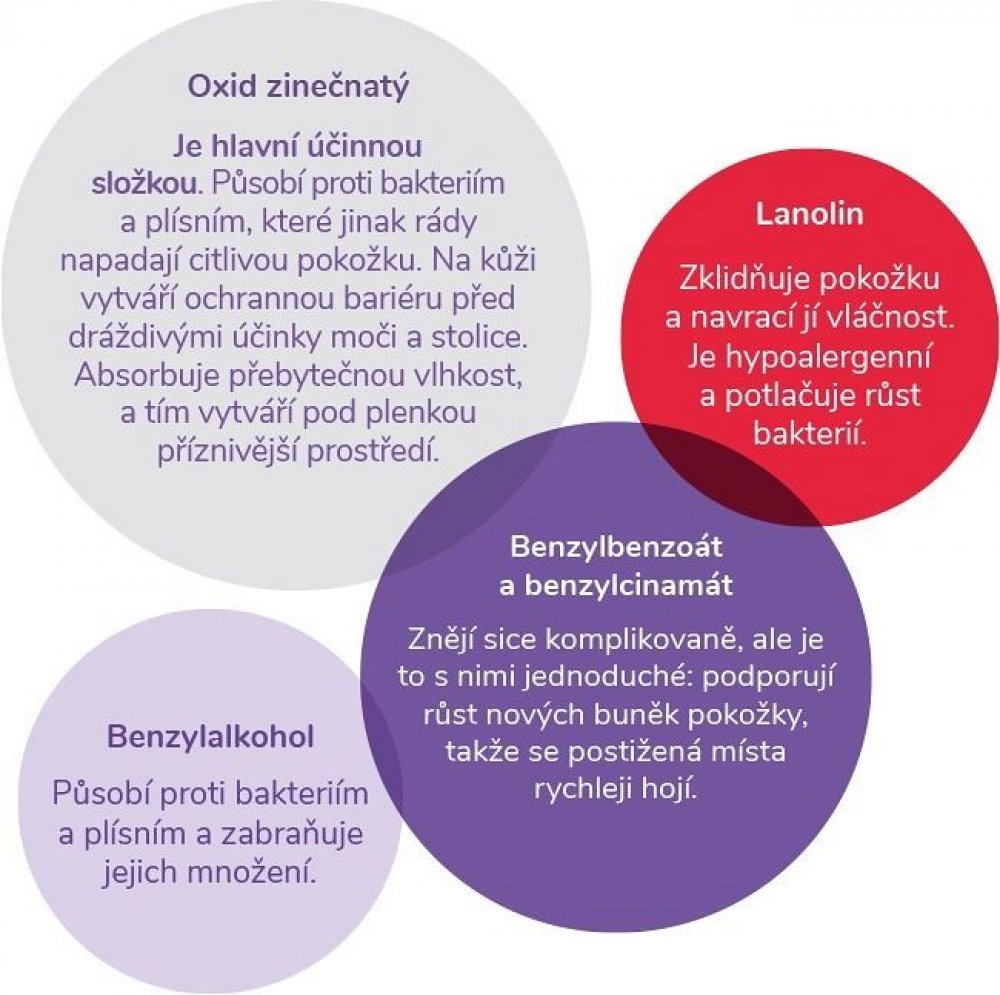 Složení přípravku zůstalo téměř nezměněno od roku 1931. Formule dává přípravku vlastnosti, díky kterým zklidňuje a podporuje léčbu podrážděné pokožky a navíc citlivou pokožku chrání.