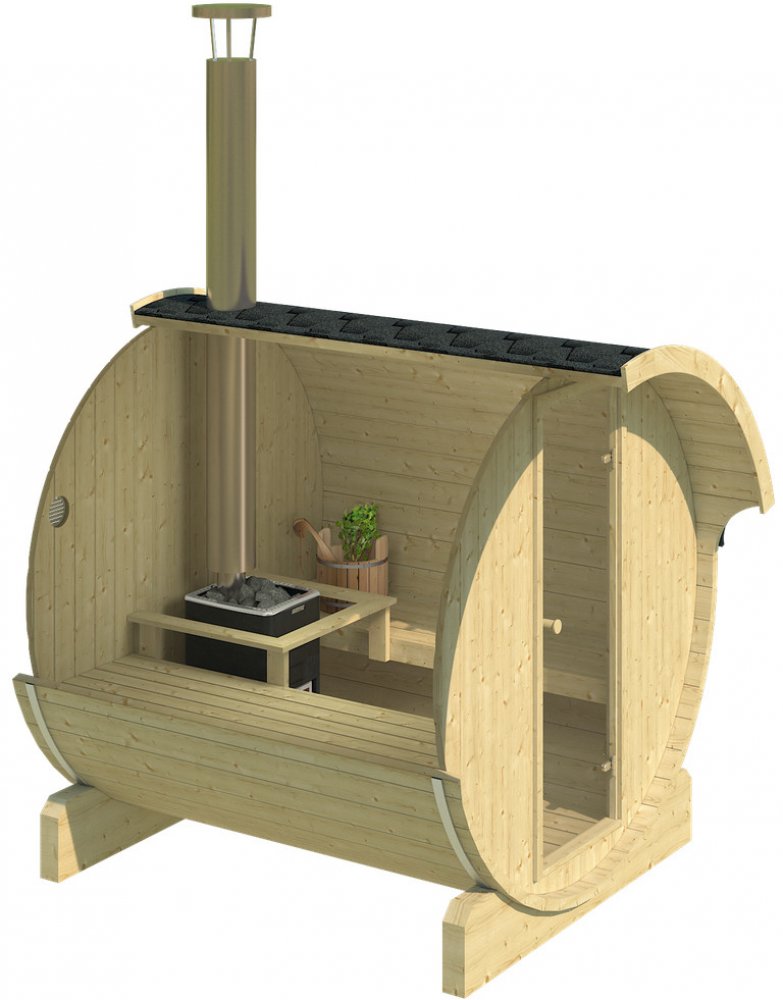 Sudová sauna pro až 4 osoby vyrobena z kvalitního sibiřského smrku. Rozměry sauny jsou 2200 x 2050 mm. Sauna je díky svým rozměrům vhodná do každé zahrady. Tuto saunu můžete vytápět pomocí elektrických kamen nebo kamny na dřevo. Sauna je dodávána včetně podlahy, šindele, lavic, ventilace, skleněných nebo dřevěných dveří, ozdobného lemu, nerezové obruče, dvou podpěr a odkloněného ukončení střechy po stranách.
