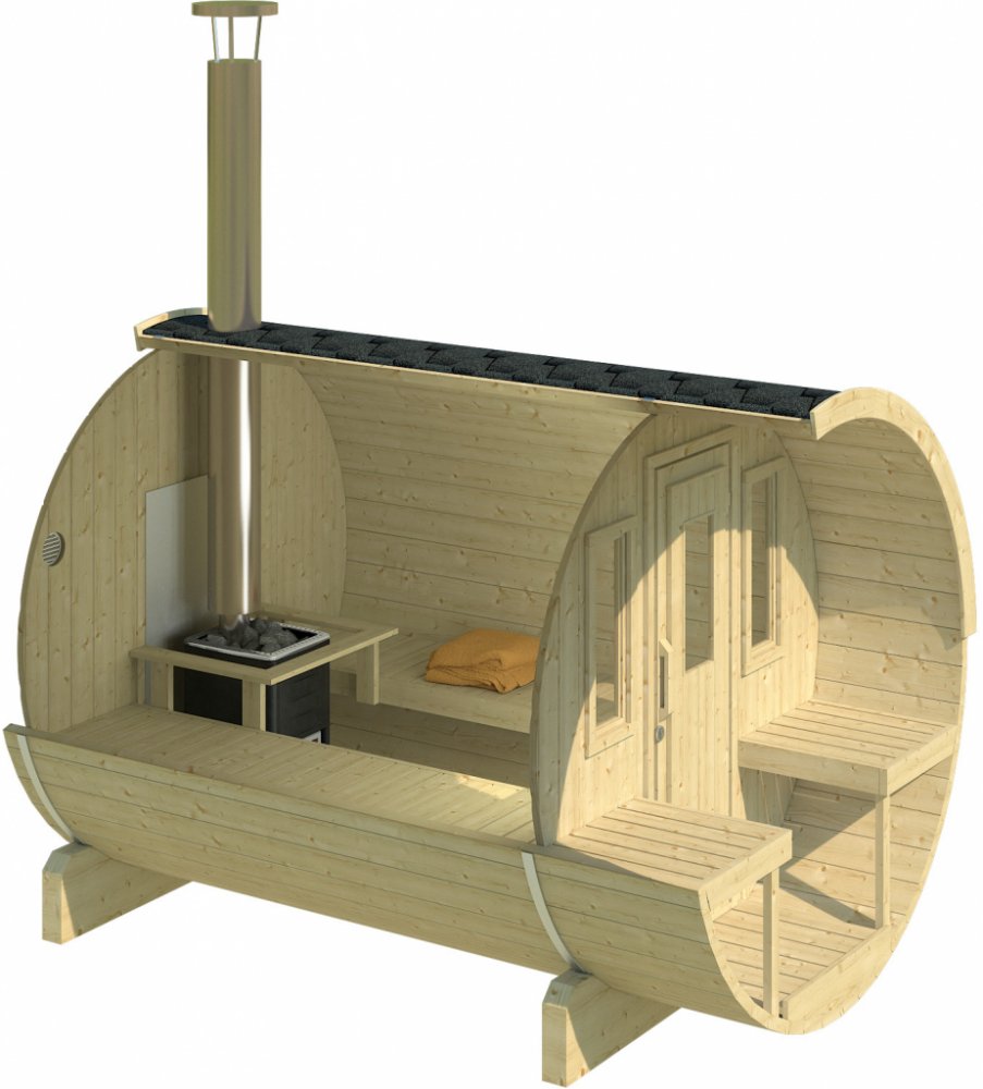 Sudová sauna pro až 4 osoby vyrobena z kvalitního sibiřského smrku. Rozměry sauny jsou 2200 x 2050 mm. Sauna je díky svým rozměrům vhodná do každé zahrady. Tuto saunu můžete vytápět pomocí elektrických kamen nebo kamny na dřevo. Sauna je dodávána včetně podlahy, šindele, lavic, ventilace, dvou oken na zadní stěně, skleněných nebo dřevěných dveří, ozdobného lemu, nerezové obruče, dvou podpěr a odkloněného ukončení střechy po stranách.