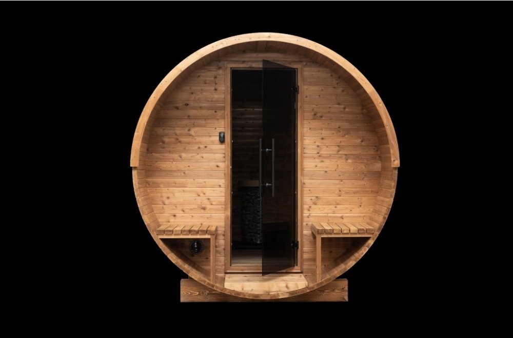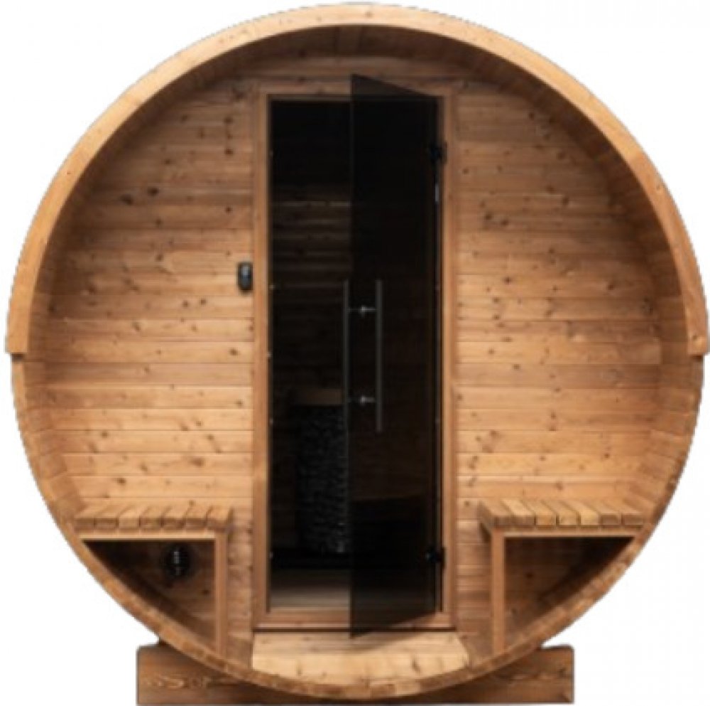 Z venkovní sudové sauny je krásný výhled do přírody přes prosklené dveře a okna. Tato sauna má celkovou délku 300 cm. Vytápí se elektrickými kamny nebo kamny na tuhá paliva včetně komínového systému.