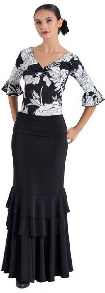 Skvostná sukně čisté linie, krásně obepínající postavu. Zvýšený pas umožňující tři varianty nošení (sukně se zvýšeným pasem, sukně s pasem ohrnutým přes boky, šaty bez ramínek). Třívrstvé kanýry různé délky v dolní třetině. Příjemný materiál. Snadná údržba. Sukně, která dokonale ctí pohyb při tanci a umocňuje celkový zážitek z tance. Jeden z důvodů, proč je tato sukně tou pravou volbou!