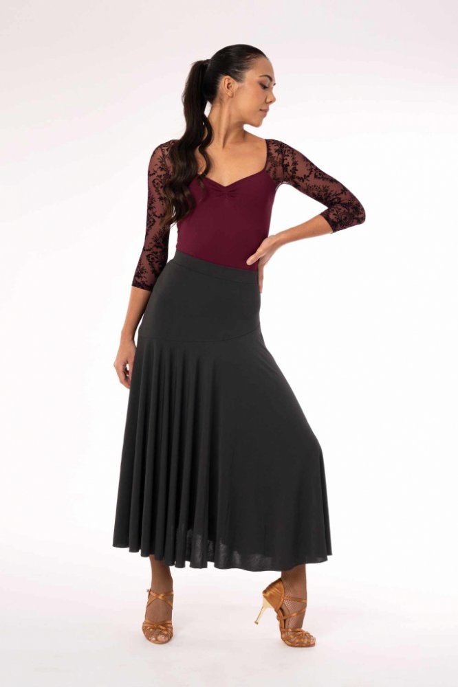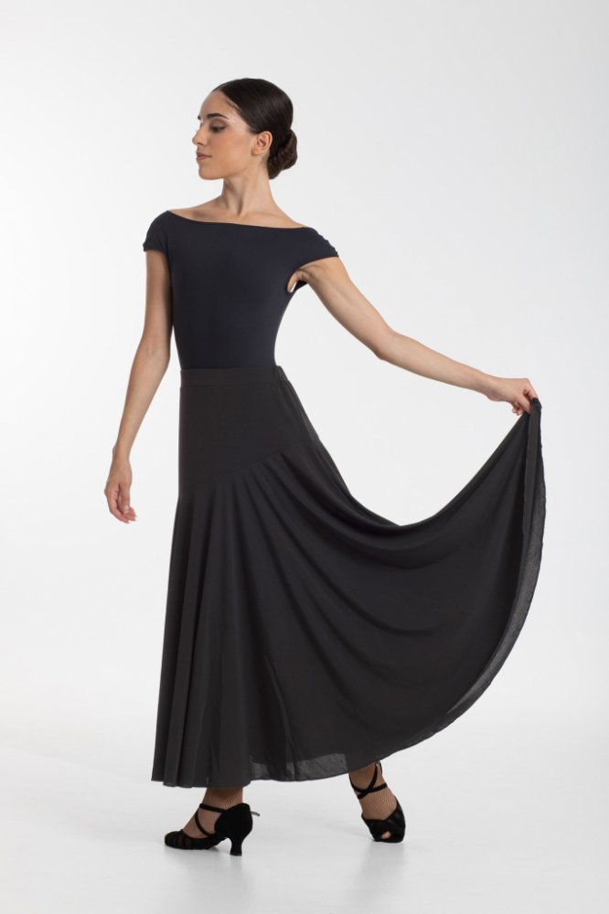 Kolová sukně se šikmo střiženým švem. Od pasu je široký pruh látky lehce obepínající postavu, na který navazuje kolová sukně. Materiál je neprůhledný a tančivý. Sukni můžete využít při trénincích standardních tanců nebo flamenca.