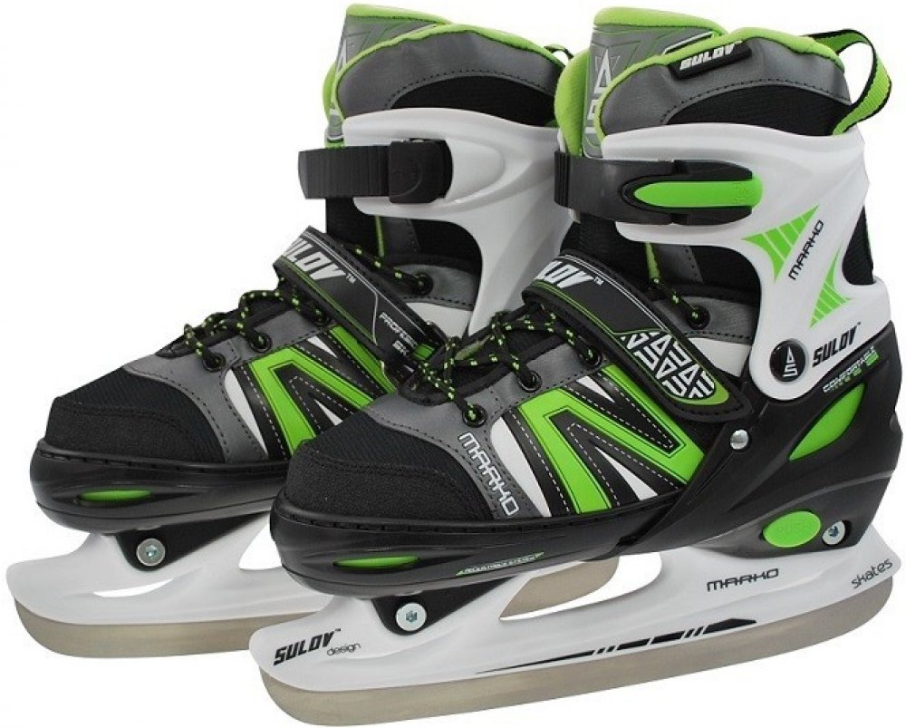 Chlapecké nastavitelné zimní brusle. Rychleschnoucí prodyšná výstelka pro pohodlné nošení. Brusli lze jednoduše nastavit dle potřeby na 4 velikosti pouhým stisknutím tlačítka na boku v patě brusle.