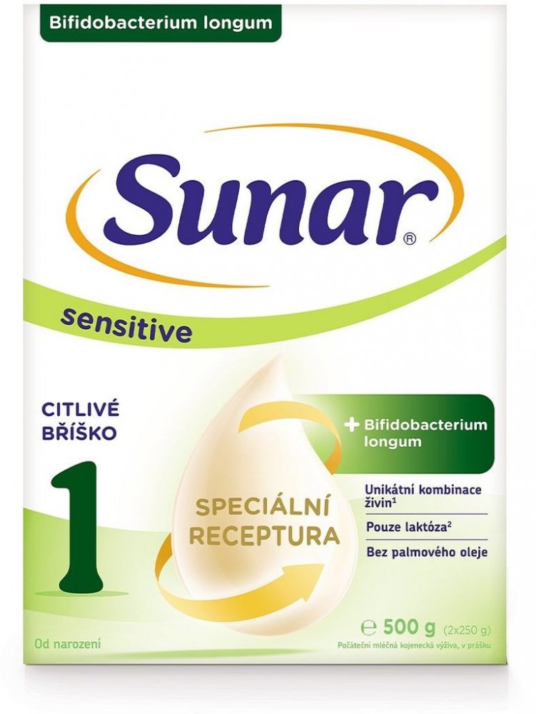 Sunar Sensitive 1 je kojenecká mléčná výživa s PROBIOTIKY pro miminka od narození, určena pro CITLIVÉ BŘÍŠKO vašeho děťátka. Jedná se o unikátní kombinaci látek podle vzoru mateřského mléka s obsahem bakterií Bifidobacterium longum, které se přirozeně nacházejí ve střevním mikrobiomu kojených dětí.