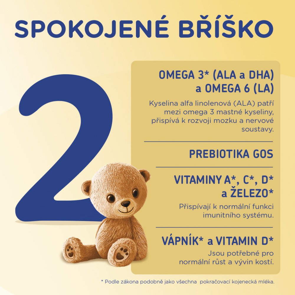 Složení výrobku: sušené plnotučné mléko, sušená demineralizovaná syrovátková bílkovina, laktóza, rostlinné oleje (obohacené o beta-palmitát), maltodextrin, vláknina (galaktooligosacharidy), sušené odtučněné mléko, minerální látky (viz tabulka), vitaminy (viz tabulka), taurin, cholin, emulgátor: sójový lecitin.