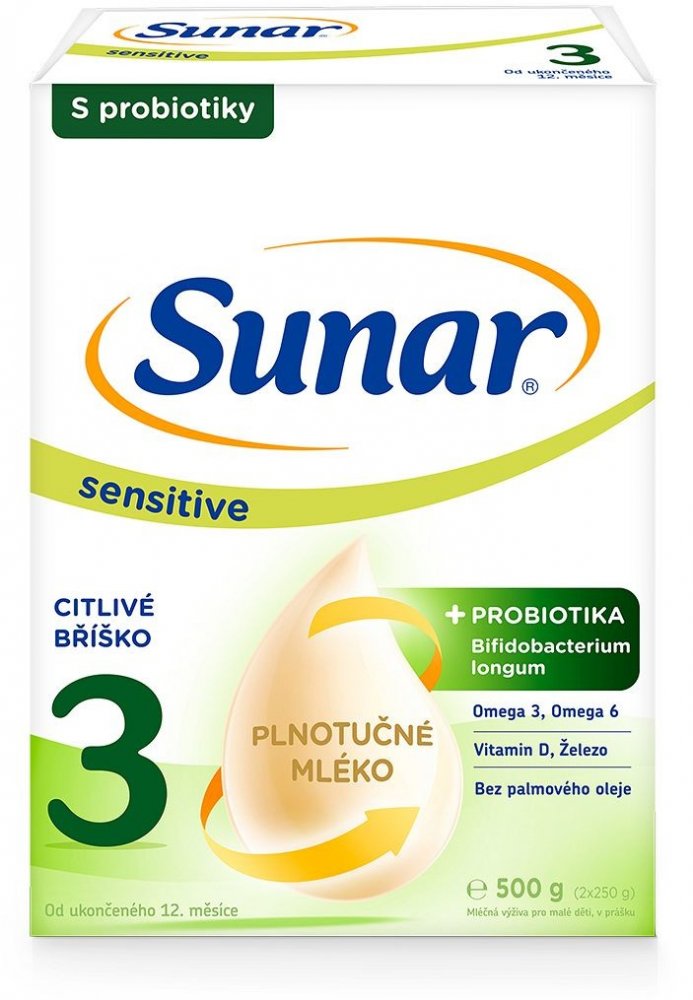 Sunar Sensitive 3 je mléčná výživa s probiotiky pro děti od ukončeného 12. měsíce, určená pro citlivé bříško vašeho děťátka. Jedná se o unikátní recepturu po vzoru mateřského mléka s obsahem probiotik (Bifidobacterium longum).