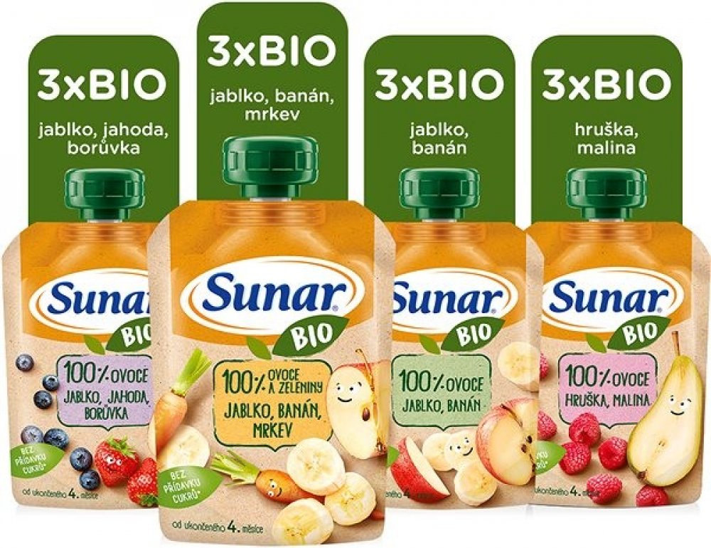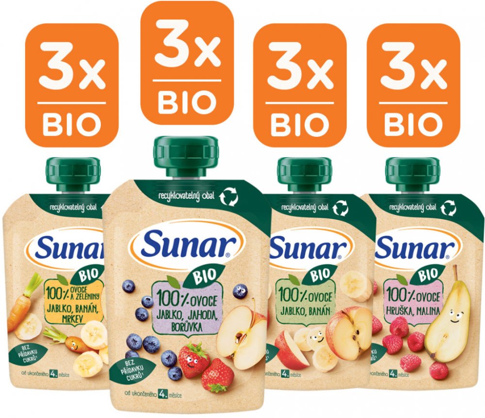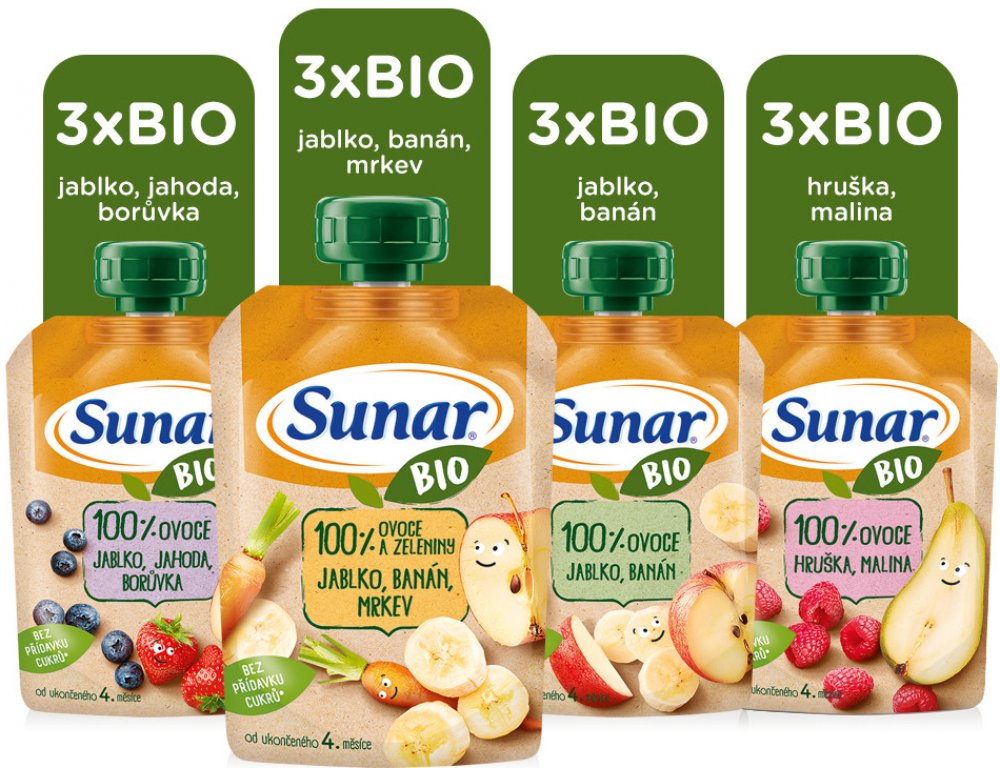 Sunar BIO je ovocná kapsička nabitá šťavnatým vyzrálým ovocem v BIO Baby kvalitě. Přesnídávka vhodná pro děti od ukončeného 4. měsíce věku, takže poslouží jako první příkrm při zavádění ovoce a zeleniny do stravy dítěte. Samozřejmostí je složení bez přidaného cukru, aromat a barviv.