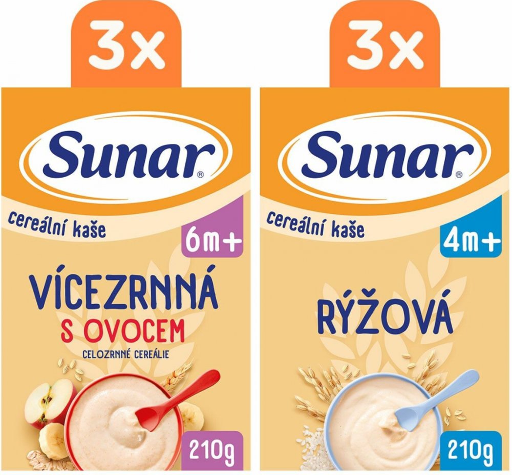 Sunar Kaše Multipack – Rýžová a Vícezrnná s ovocem. Výhodné balení dvou oblíbených kojeneckých kaší Sunar od ukončeného 4. a 6. měsíce. Bez přidaného cukru*. Proč si vybrat Sunar cereální kašiNeobsahují přidaný cukr*Jsou obohacené o vitaminy, železo a vápník**Jsou ideální jako první kaše (rýžová) nebo pro zavádění lepku do stravy dítěte (vícezrnná)Rychlá a snadná příprava – s vodou, mateřským nebo kojeneckým mlékemMléčná kaše Sunar mixVýživa pro správný start do života - Sunar kaše jsou vyrobené z kvalitních a pečlivě vybraných surovin, které odpovídají nárokům kojenecké výživy.Bez přidaného cukru * - Budovat správné stravovací návyky je důležité už od útlého věku dětí, proto do Sunar kaší nepřidáváme žádný cukr. Kaše obsahují pouze přirozeně se vyskytující cukry z ingrediencí. S obsahem 8 vitaminů, železa a vápníku **- Kaše jsou jedním z prvních příkrmů a pomáhají přijímat důležité živiny a minerální látky. Vápník přispívá k normálnímu růstu kostí, železo pak pomáhá správné činnosti...