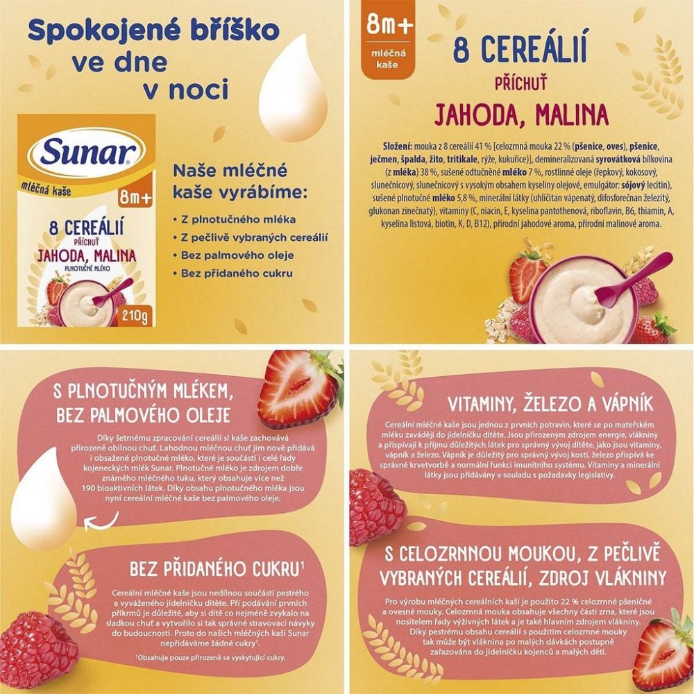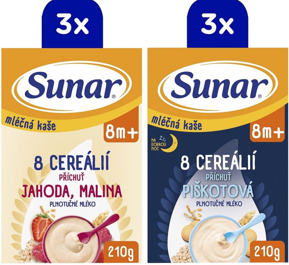 Mléčná kaše Sunar patří k ideálním večeřím či snídaním malých dětí. Multicereální (vícezrnná) kaše je určena pro kojence i batolata a je tvořena pouze z kvalitních surovin. Je určena dětem od 9 měsíců. Nabízená jahodová, malinová a piškotová mléčná kaše je příjemně sladká, a dětem tak bude velice chutnat. Balení obsahuje 6 mléčných kaší Sunar. Jejich celková hmotnost činí 1260 g. Přidané minerály a vitamíny podporují zdravý vývoj dítěte. Nabízenou variantu bez přidaného cukru si vaše dítko rychle oblíbí. Mléčná kaše s kravským mlékem pomůže získat vašemu děťátku vše potřebné. Hlavní přednosti produktu Sunar mléčná kaše 8 cereálií mix příchutí 8m+, 6× 210 g Multicereální (vícezrnná) mléčná kaše Sunar bude zdravá večeře nebo snídaně pro dítě Její používání je vhodné od 9 měsíců Oceníte i přidané vitamíny a minerály Mléčná kaše Sunar je bez přidaného cukru Tato varianta má hmotnost 1260 g V balení najdete 6 ks Jahodová, malinová a piškotová příchuť
