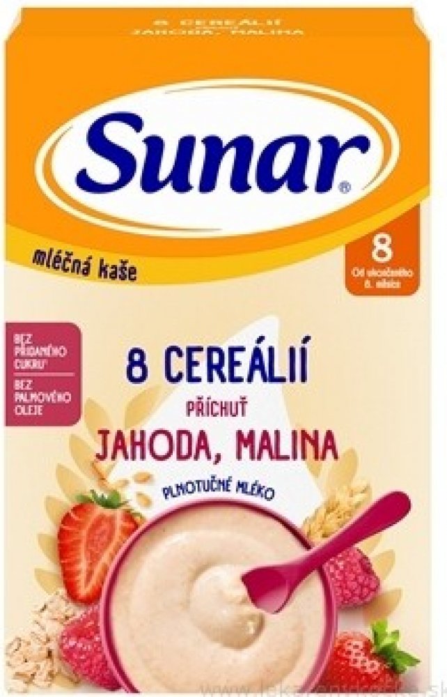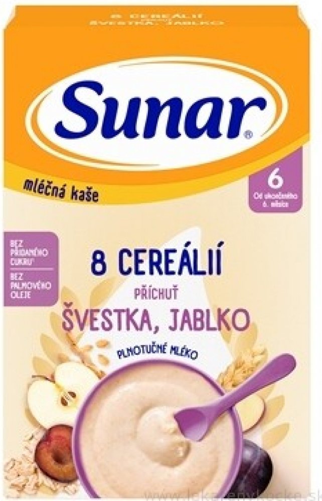 Sunar mléčná kaše s 8 cereáliemi skvěle chutná díky obsahu plnotučného mléka. Celozrnné cereálie v kaši jsou skvělým zdrojem vlákniny. Obsahuje lepek. Vhodné pro děti od ukončeného 6. měsíce.