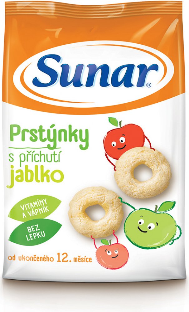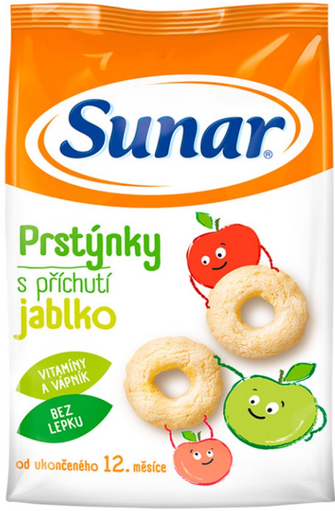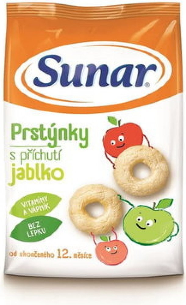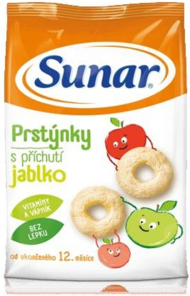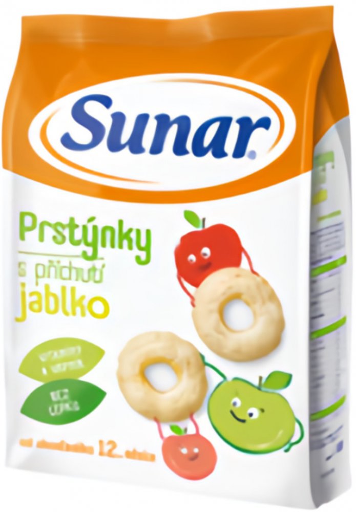 Sunar dětské křupky jablečné prstýnky 50 g Jablečné křupky obohacené o vitamín B1 a vápník. Obsahují cukr, proto by měly být pro dítě jen zpestřením. Podávejte pod dozorem maminky, aby nezaskočilo. Vhodné pro děti od ukončeného 12. měsíce.