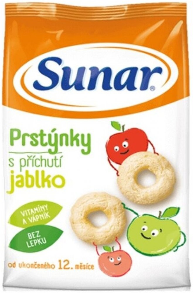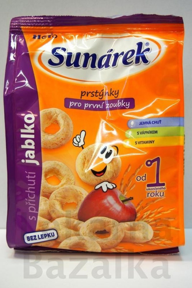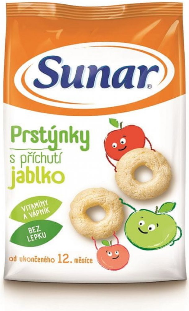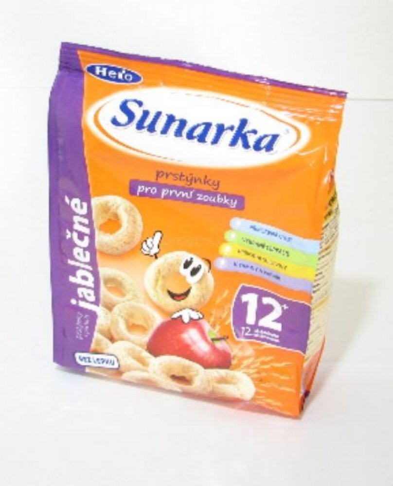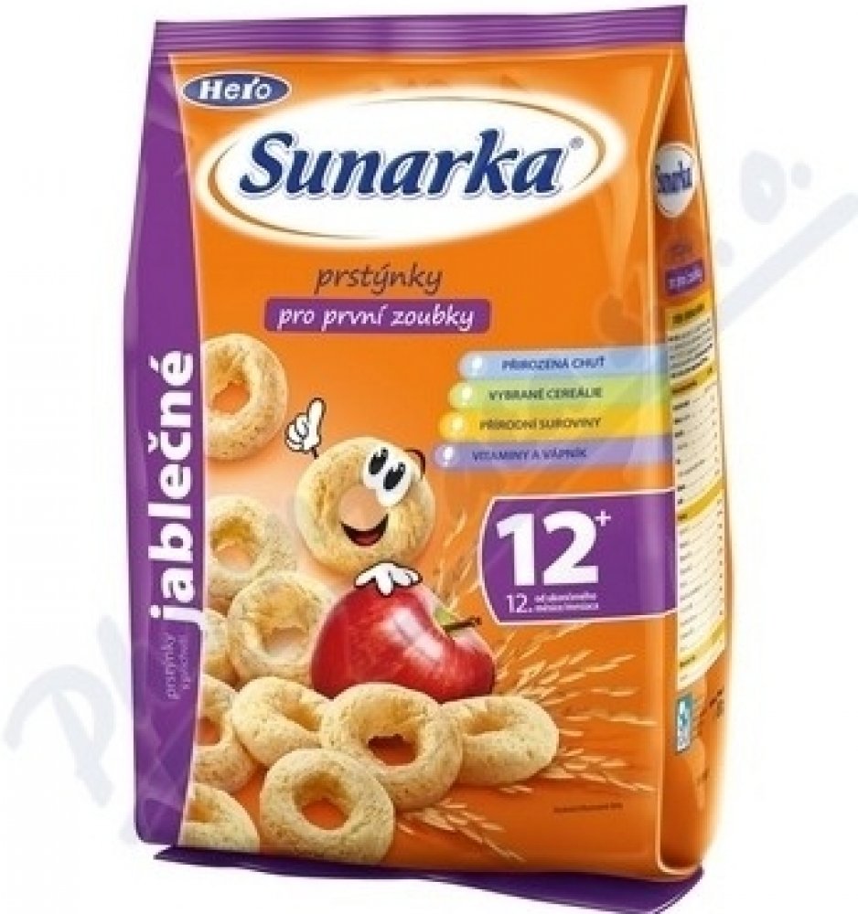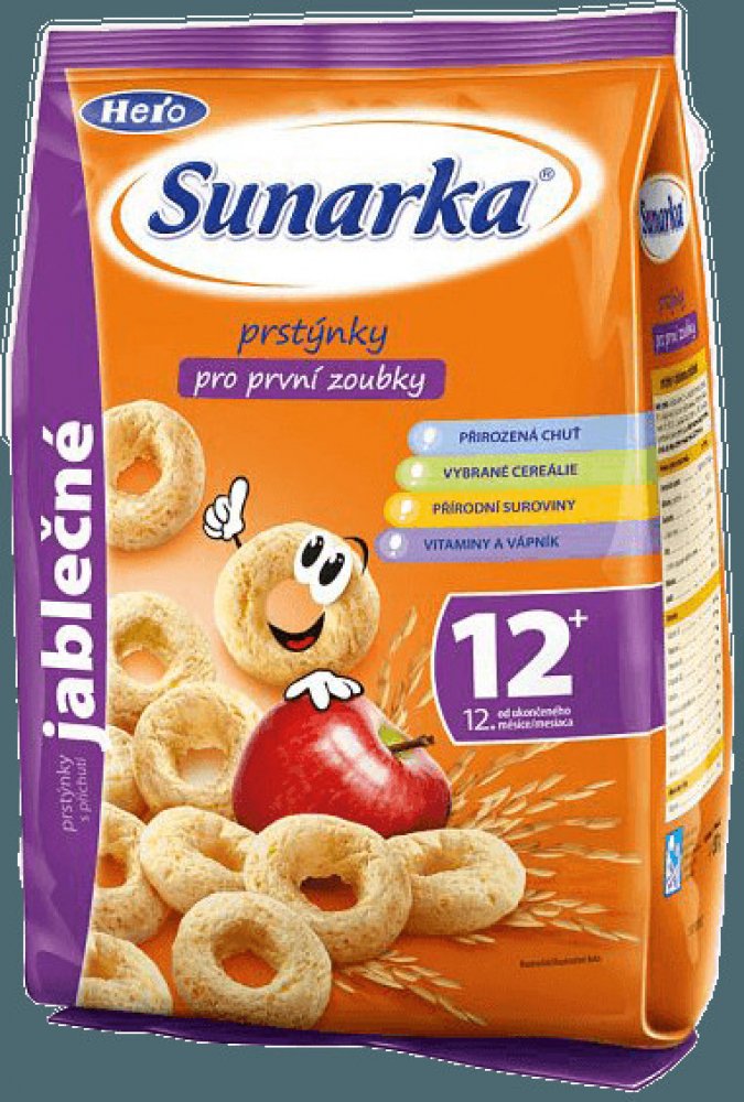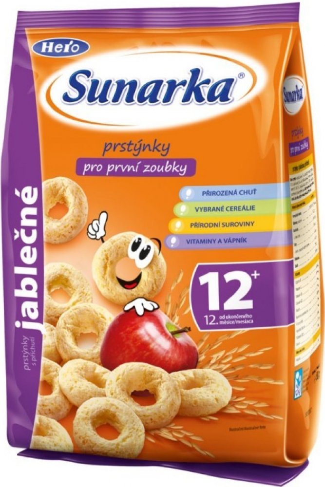 Jediné snacky od uk. 12. měsíce ve vysoké kvalitě odpovídající přísným požadavkům na dětskou výživu dětí do 3 let. Sunarka prstýnky s jablečnou příchutí jsou skvělým obohacením jídelníčku malých dětí. Jsou vyrobeny z pečlivě vybrané a vysoce kvalitní kukuřičné a rýžové mouky, jsou tedy bezlepkové. Sunarka prstýnky s jablečnou příchutí jsou obohaceny o významné vitaminy skupiny B, vitamin C a vápník. Vápník je pro děti velmi důležitý, jelikož je potřebný pro normální růst a vývin kostí. 1 porce snacků Sunarka prstýnky s jablečnou příchutí – 15 g (cca 33 ks) obsahuje 89 mg vápníku, což představuje asi 22% referenční hodnoty. Tvar kukuřičných prstýnků je přizpůsoben malým dětským ručičkám, snadno se uchopí a tak se při jejich konzumaci rozvíjí i motorické schopnosti – zručnost a koordinace pohybů. Zároveň pomáhají učit děti lépe konzumovat a žvýkat větší kousky. Konzumace prstýnků s jablečnou příchutí se tak stává pro děti zábavou. Potravina pro zvláštní výživu – potravina pro obilnou výživu kojenců a malých dětí od ukončeného 12. měsíce. Extrudovaný výrobek.