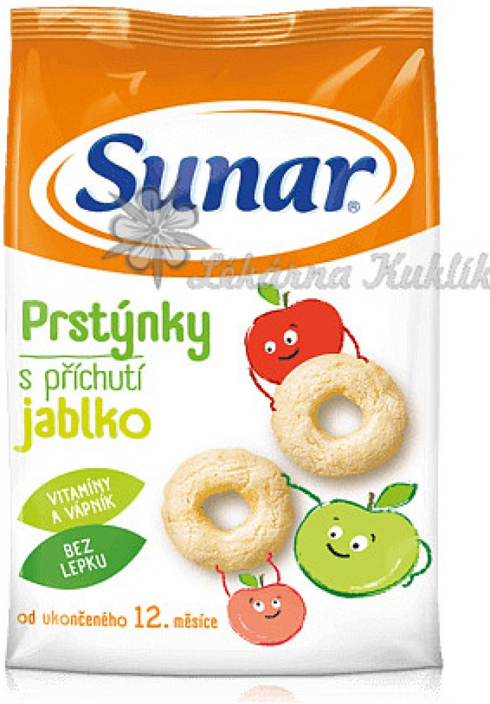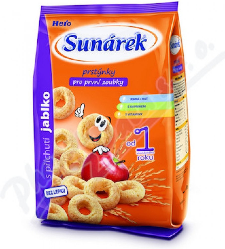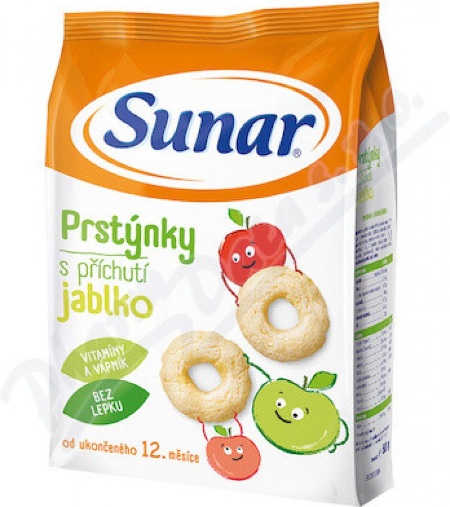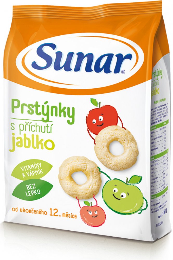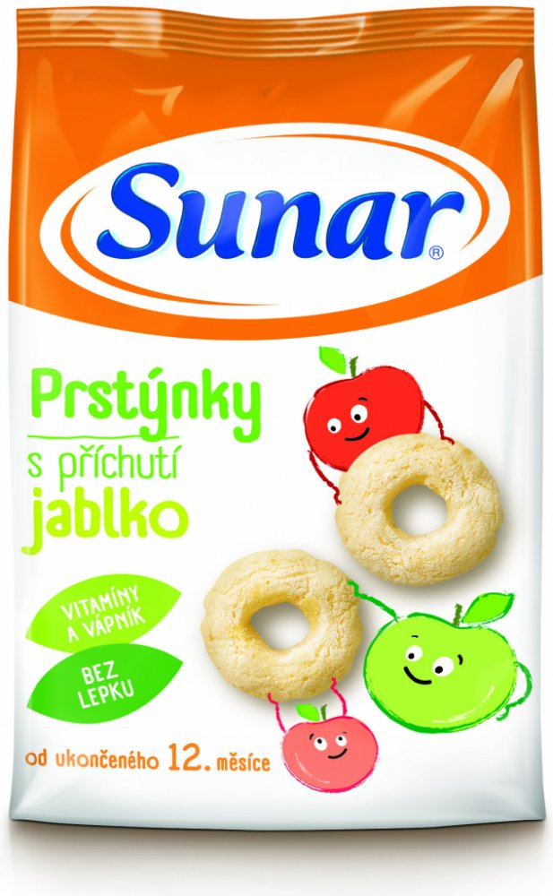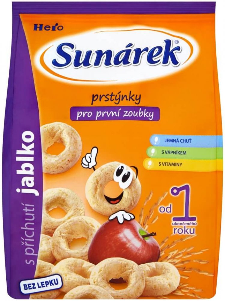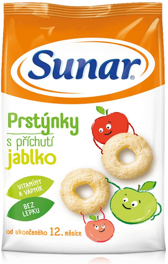 Jediné snacky od uk. 12. měsíce ve vysoké kvalitě odpovídající přísným požadavkům na dětskou výživu dětí do 3 let. Sunarka prstýnky s jablečnou příchutí jsou skvělým obohacením jídelníčku malých dětí. Jsou vyrobeny z pečlivě vybrané a vysoce kvalitní kukuřičné a rýžové mouky, jsou tedy bezlepkové. Sunarka prstýnky s jablečnou příchutí jsou obohaceny o významné vitaminy skupiny B, vitamin C a vápník. Vápník je pro děti velmi důležitý, jelikož je potřebný pro normální růst a vývin kostí. 1 porce snacků Sunarka prstýnky s jablečnou příchutí – 15 g (cca 33 ks) obsahuje 89 mg vápníku, což představuje asi 22% referenční hodnoty. Tvar kukuřičných prstýnků je přizpůsoben malým dětským ručičkám, snadno se uchopí a tak se při jejich konzumaci rozvíjí i motorické schopnosti – zručnost a koordinace pohybů. Zároveň pomáhají učit děti lépe konzumovat a žvýkat větší kousky. Konzumace prstýnků s jablečnou příchutí se tak stává pro děti zábavou. Potravina pro zvláštní výživu – potravina pro obilnou výživu kojenců a malých dětí od ukončeného 12. měsíce. Extrudovaný výrobek.