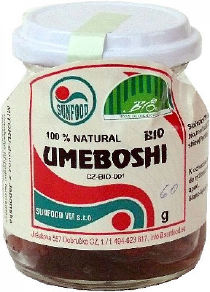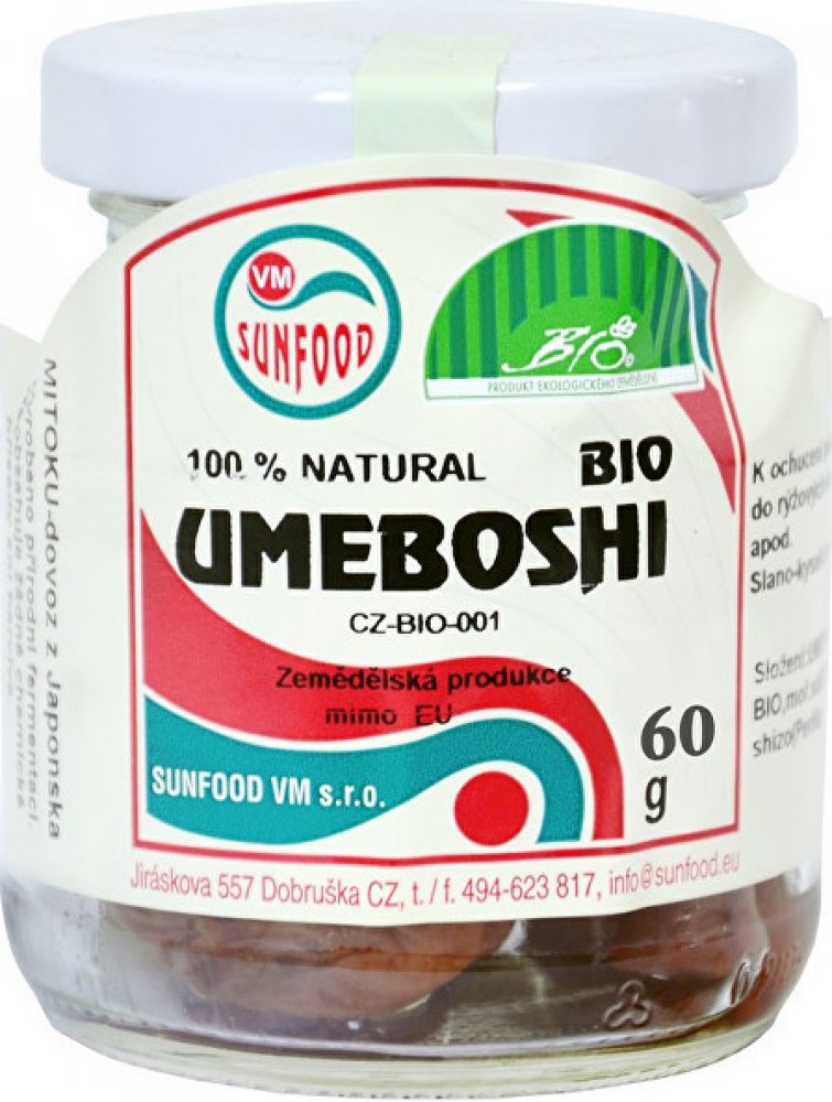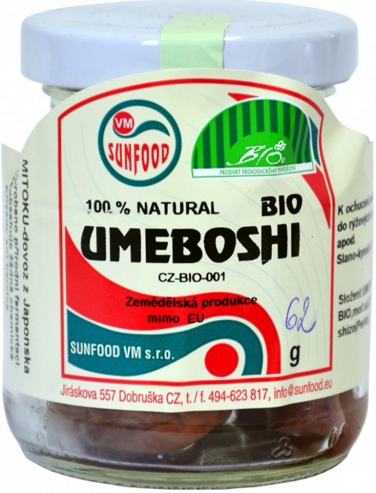 Umeboshi obsahují velké množství kyseliny citrónové, která pomáhá vylučovat z těla kyselinu mléčnou a odstraňuje tím únavu. Proto jsou umeboshi známým prostředkem pro získání svěžesti, vitality a pro zpomalení stárnutí. Prospívají i našemu zažívacímu traktu, ulevují při zácpě nebo průjmech, působí proti pálení žáhy a ulevují při střevních problémech. Likvidují střevní parazity a plísně v trávicím traktu. Podporují správnou funkci jater. Mají vysoký obsah železa, vápníku a fosforu. Umeboshi obsahují bílkoviny, minerály a tuky v větším množství než jiné druhy ovoce. Jsou zvláště bohaté na vápník, železo a fosfor, mangan, sodík, hořčík apod. Jsou také mnohem bohatší na organické kyseliny než jiné ovoce. Tyto kyseliny se při procesu výroby nerozkládají.Složení Umeboshi Bio, mořská sůl (22 %), shizo (Perilla)