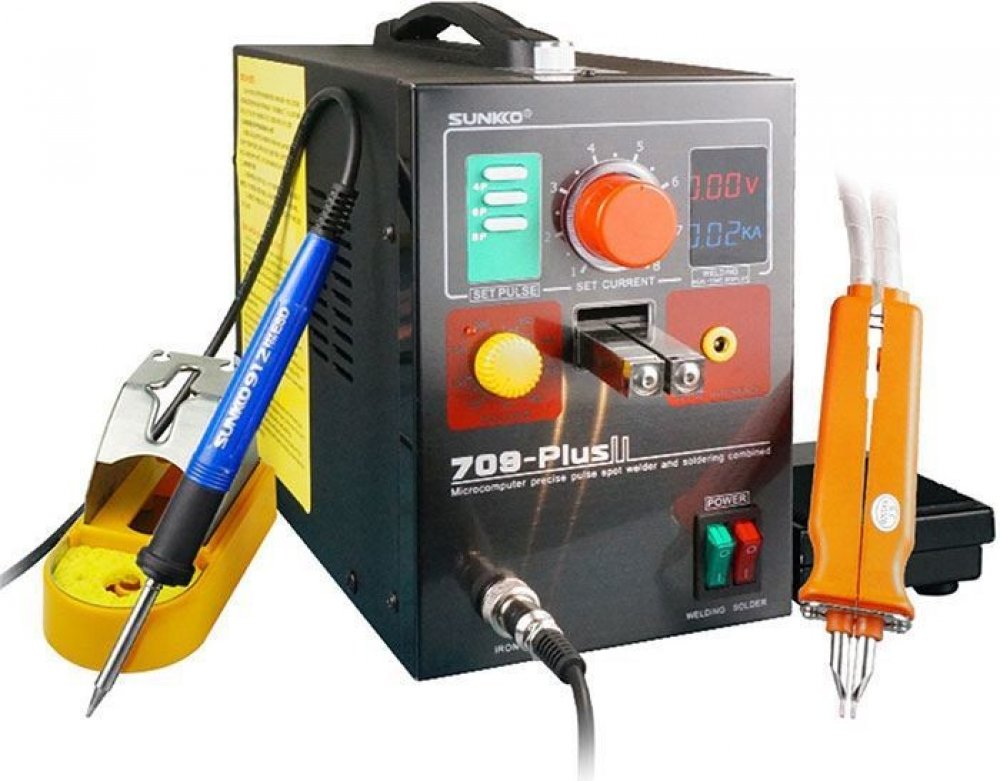 SUNKKO 709PLUS je bodová svářečka pro bodové svařování akumulátorů do bateriových akupacků pomocí niklových plíšků. Svařovat lze pomocí dvou bodů v těle svářečky nebo s pomocí kleští. Součástí přístroje je také mikropájka 50W s regulací teploty.Technické parametry: - okamžitý výkon: 4,3 kWh- svařovací proud: 80 – 800 A- napájení: 230 V AC 18 A (jistič min.20A/C)- počet pulsů: 2× (1–10ms), 4× (2–20...