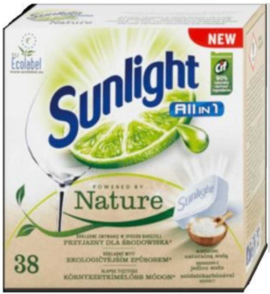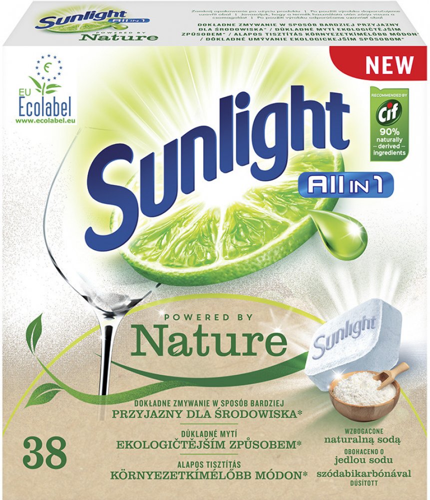 Sunlight AiO Nature 38 tab Již nemusíme dělat kompromis mezi účinností a dopadem na životní prostředí. Nové, ekologicky certifikované Sunlight All in One Powered by Nature tablety do myčky obsahují ingredience na rostlinné bázi a přírodní, biologicky odbouratelné složky. Účinek? Srovnatelný s běžnými tabletami do myčky. Navíc jsou účinné i při ekologických mycích cyklech méně náročných na spotřebu...