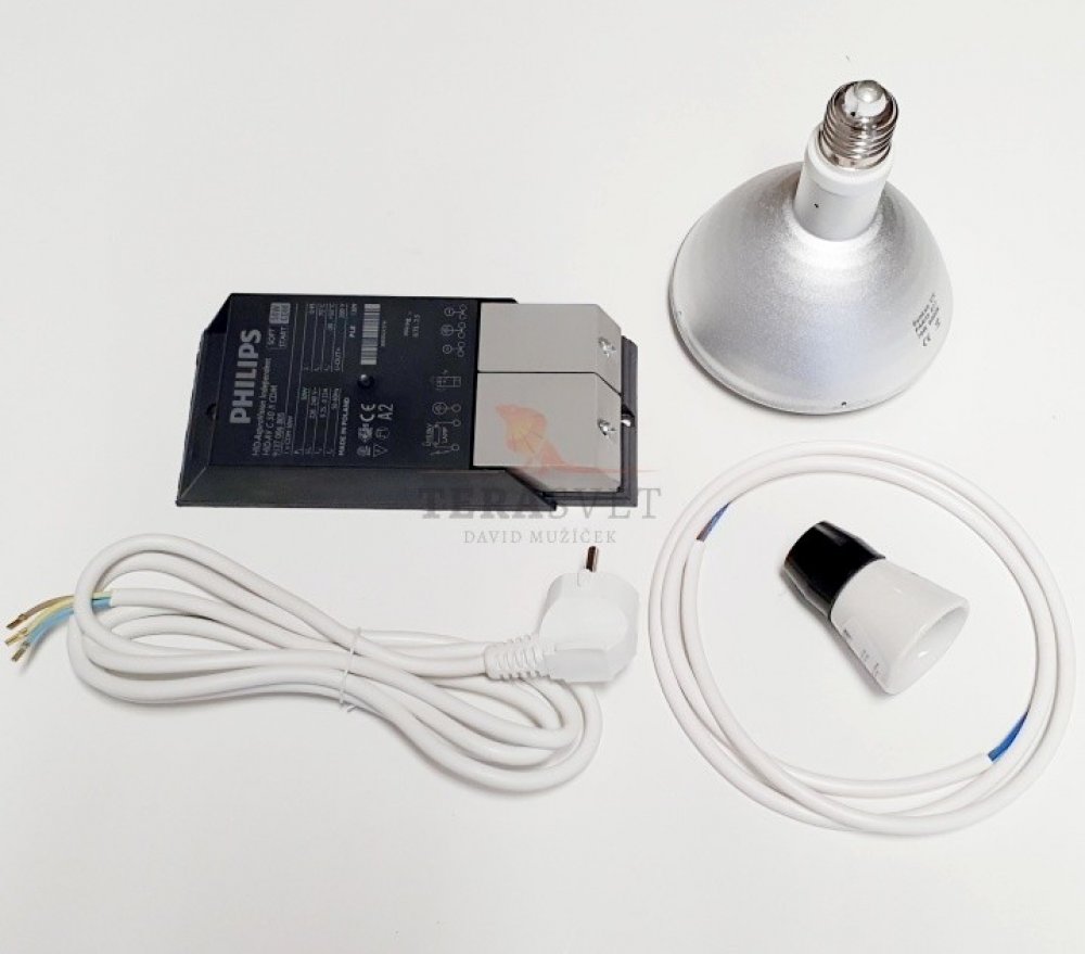 Kompletní sada obsahuje: výbojku Sunlux UV 50W PAR38, předřadník, objímku, propojovací kabel, přívodní kabel a reflektor (pokud je vybrána tato varianta).
