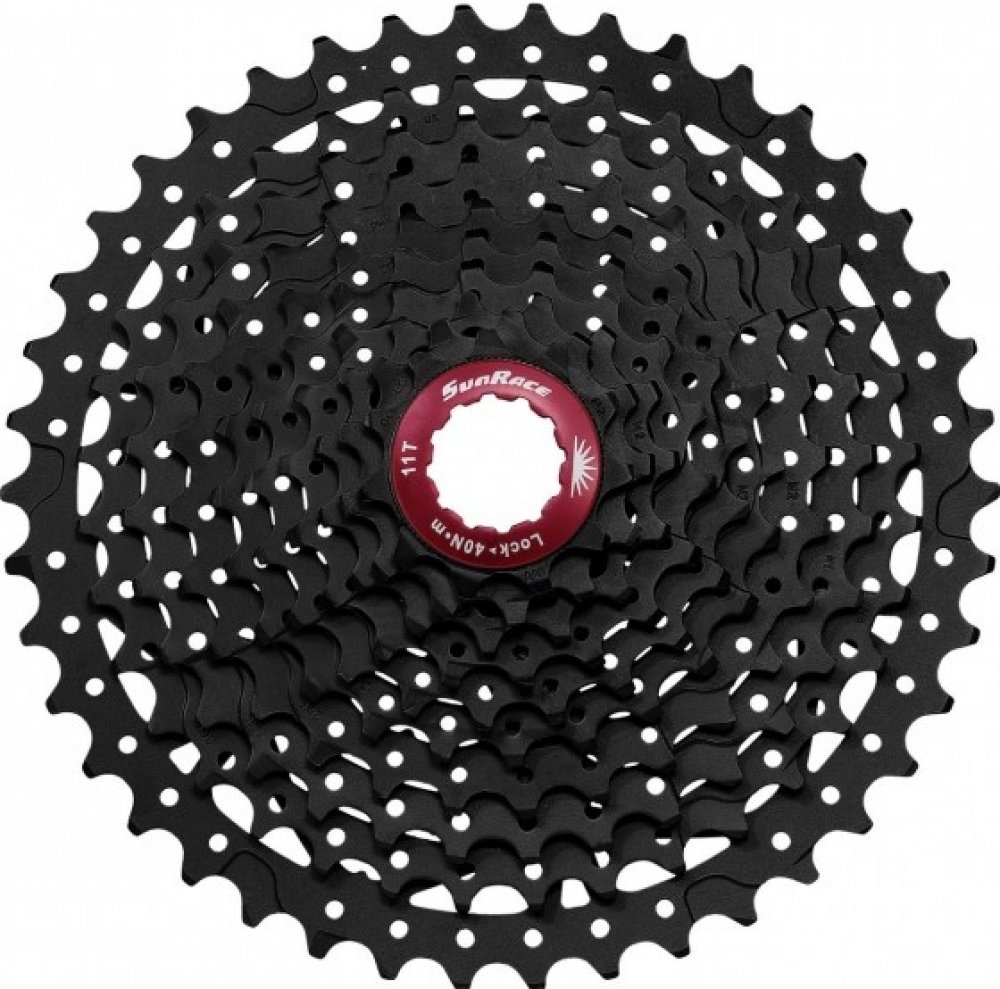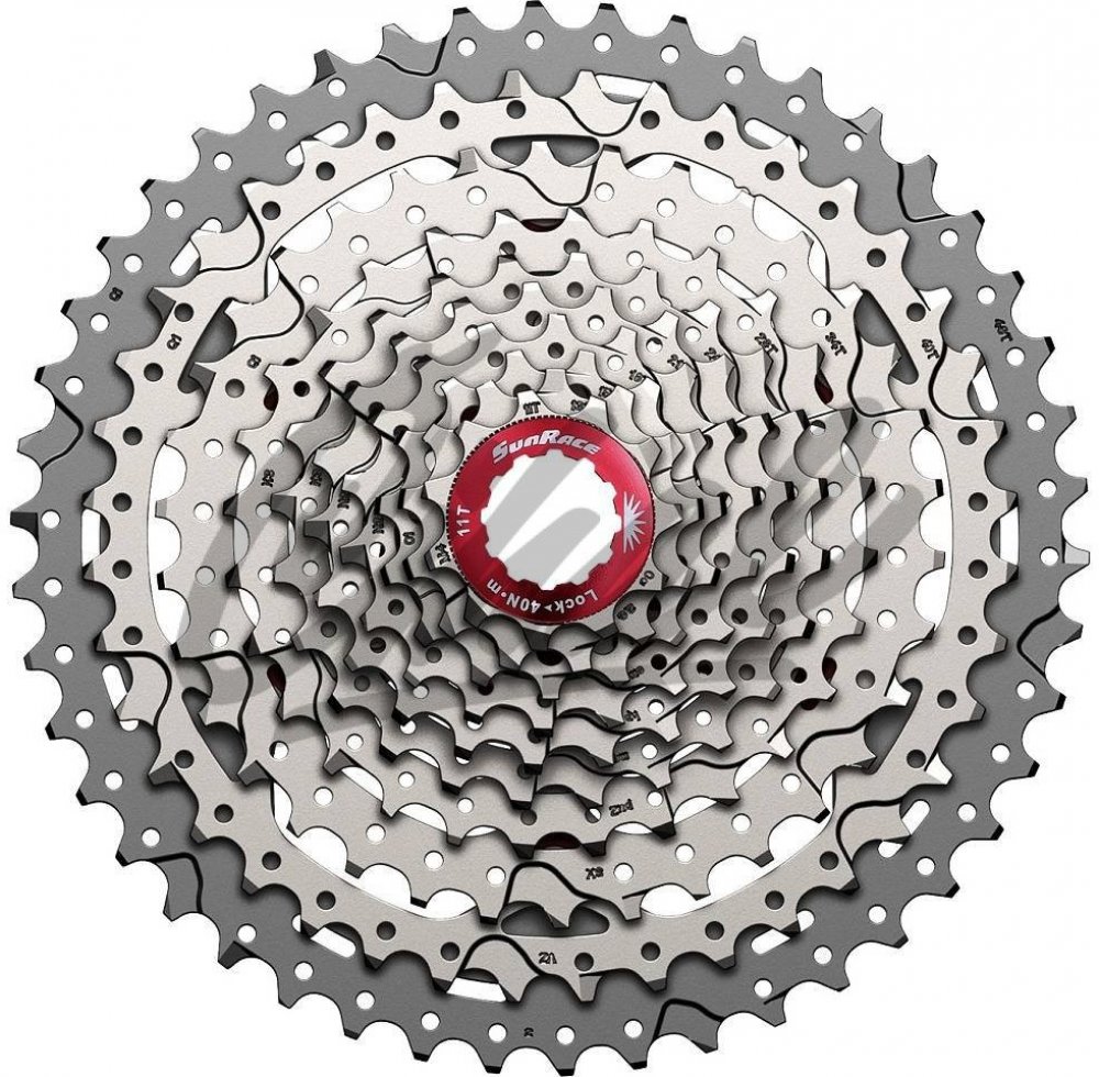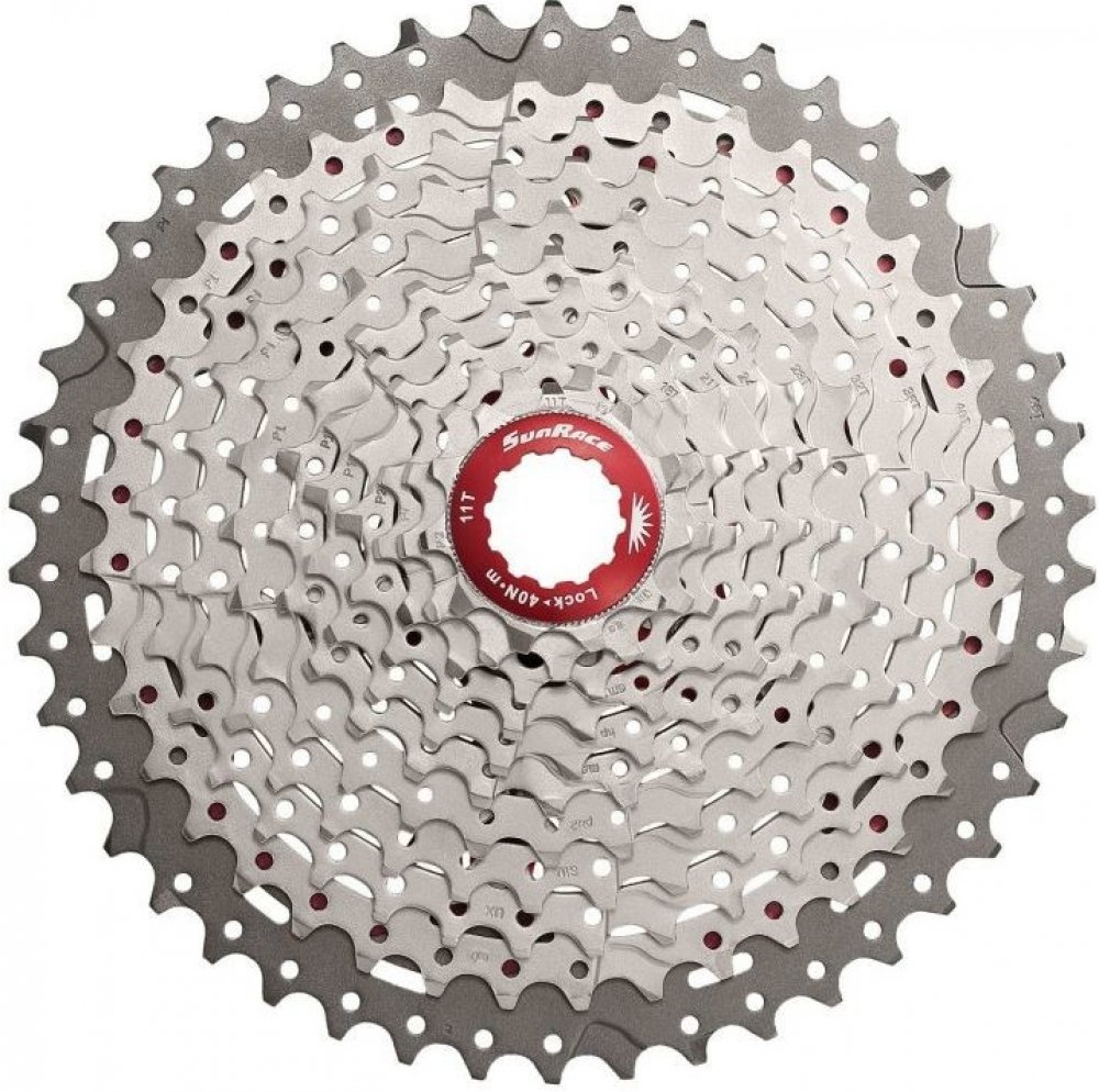 Cyklistická 10rychlostní kazeta na kolo Sunrace CSMX3 s 10 pastorky pro Shimano/Sram ořech. Spodních 9 pastorků je z tvrzené oceli, poslední horní z hliníku Al7075. Kazeta má dva hliníkové unašeče. Podložky a pojistná matice jsou také z hliníku. Kazeta je odlehčená děrováním.