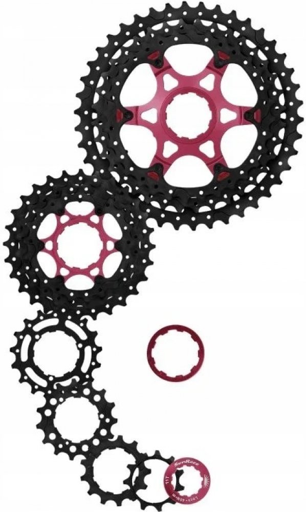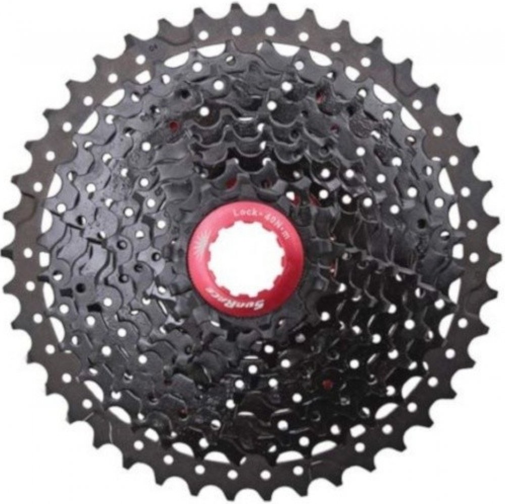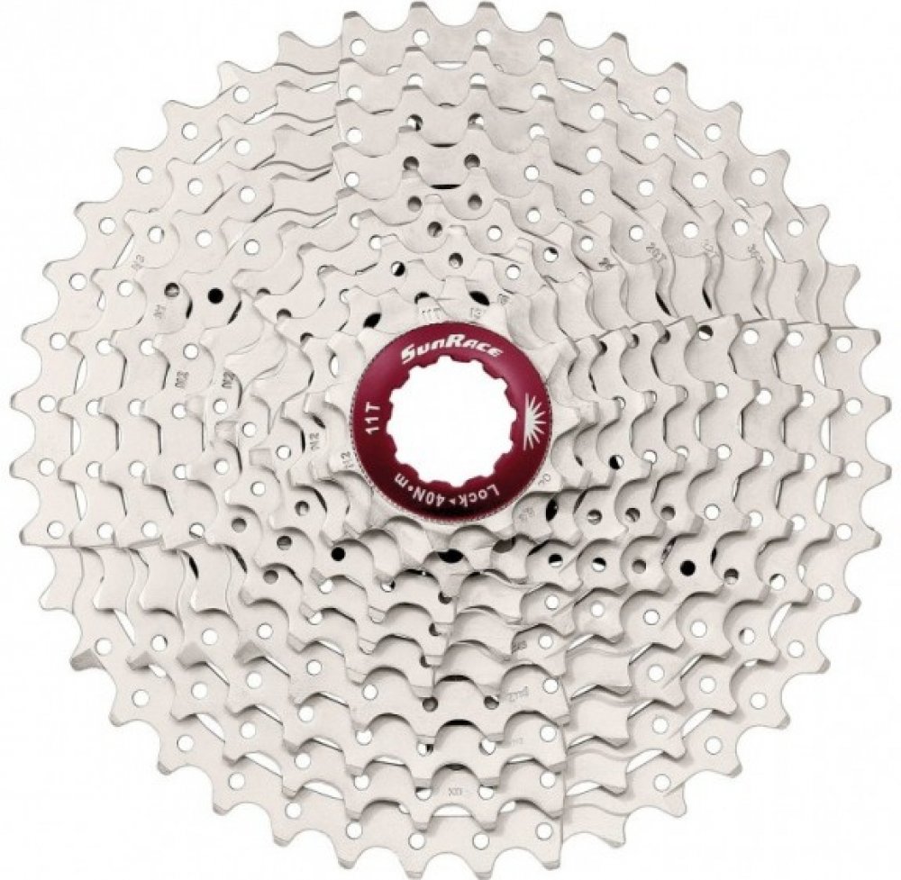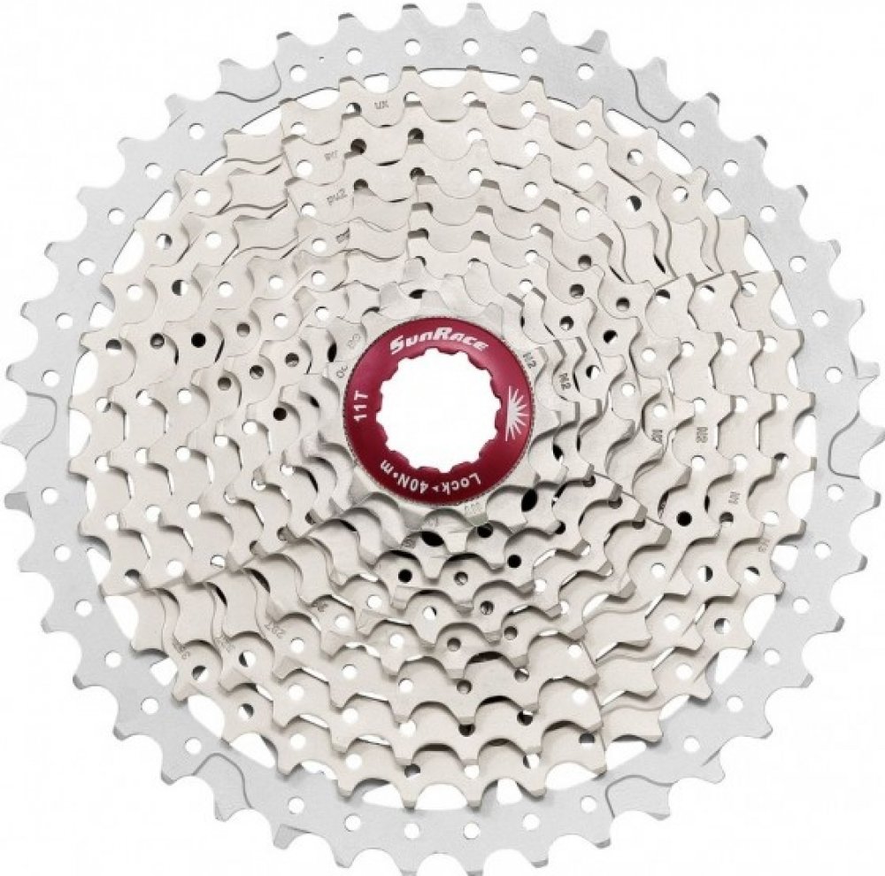 Cyklistická 10rychlostní kazeta na kolo Sunrace CSMX3 s 10 pastorky pro Shimano/Sram ořech. Spodních 9 pastorků je z tvrzené oceli, poslední horní z hliníku Al7075. Kazeta má dva hliníkové unašeče. Podložky a pojistná matice jsou také z hliníku. Kazeta je odlehčená děrováním.