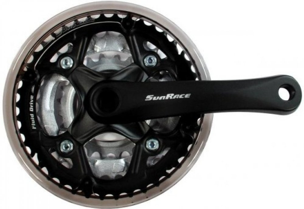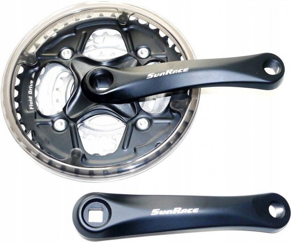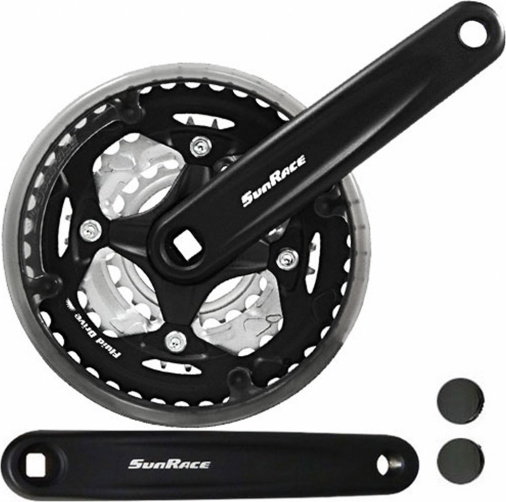 Kliky SunRace FCM513 Jedná se o trojpřevodníkové kliky určené primárně pro juniorská/dětská horská a městská kola, kde je vyžadována kratší délka klik. Základní informace a parametry: Model: FCM513 Určení: Městská a juniorská/dětská kola Systém převodů: 3 převodníky (trojpřevodník) Kompatibilita (kazeta): 6-rychlostní, 7-rychlostní a 8-rychlostní kazety Délka kliky: 152 mm Počet zubů převodníků: 42 - 34 - 24 zubů (největší/střední/nejmenší) Typ osy (středové složení): Čtyřhran (Square Taper) Materiál: Kliky jsou vyrobeny z hliníku, zatímco převodníky jsou ocelové. Hmotnost: Přibližně 803 g (hmotnost celého setu - L+P klika s převodníky). Kryt: Kliky jsou dodávány s plastovým krytem (chráničem) řetězu.