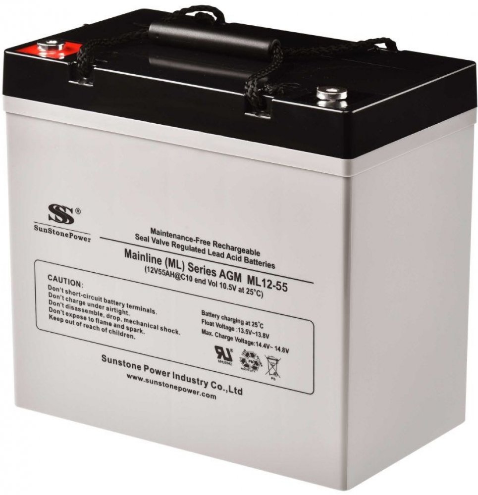 Sunstone Power ML12-55 je bezúdržbový AGM (elektrolyt vsáknutý do skelné tkaniny - obdoba gelu) VRLA (uzavřená konstrukce - plyny uvnitř rekombinují) akumulátor umožňující provoz v jakékoliv poloze. Akumulátor je konstruován s životností 10 let (v závislosti na počtu cyklů a hloubce vybití).
