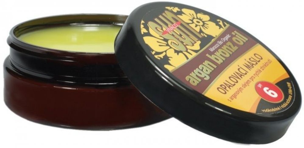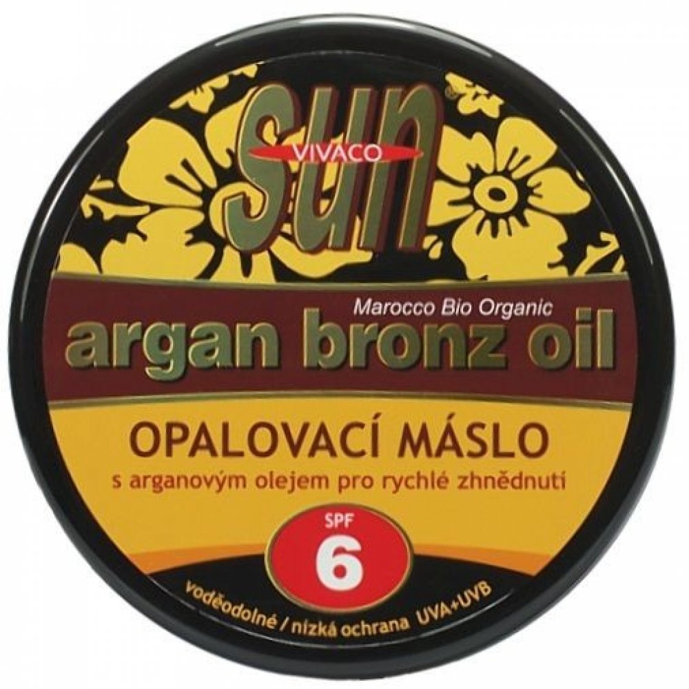 SUN Bronz opalovací máslo obsahuje bio-arganový olej a betakaroten pro intenzivní, rychlé a dlouhotrvající opálení. Zjemňující oleje s vitamínem E chrání před vysušováním a stárnutím pokožky, beta-karoten napomáhá dlouhodobému zhnědnutí pokožky. Arganový olej je díky svému složení nazýván elixírem krásy a mládí. Přípravek je voděodolný, snadno se roztírá a obsahuje ochranný faktor 6.