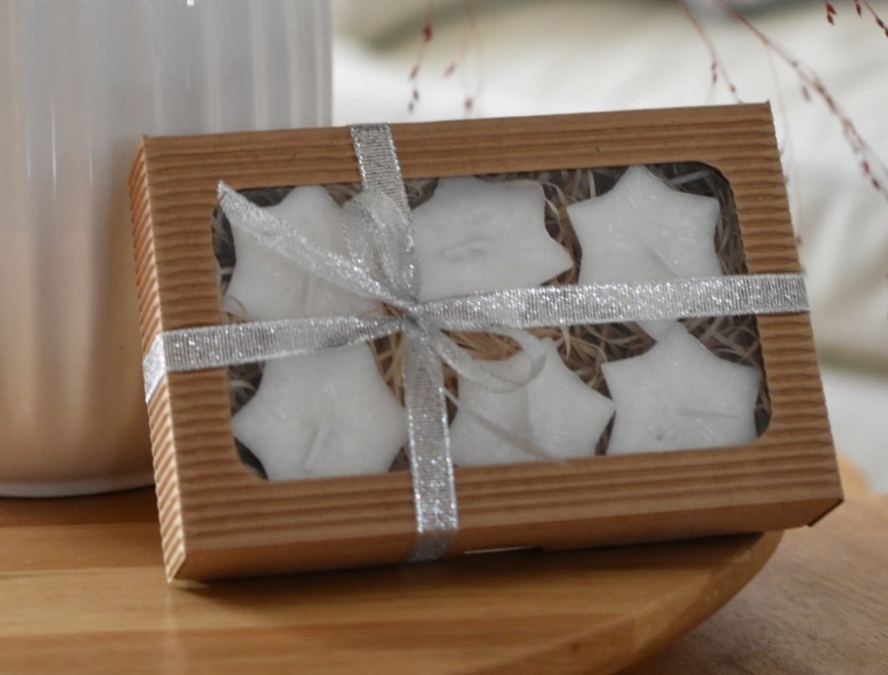 Dárková krabička - plovoucí svíčky ručně vyrobené z přírodního certifikovaného palmového vosku s překrásnou "ledovou" strukturou na povrchu.