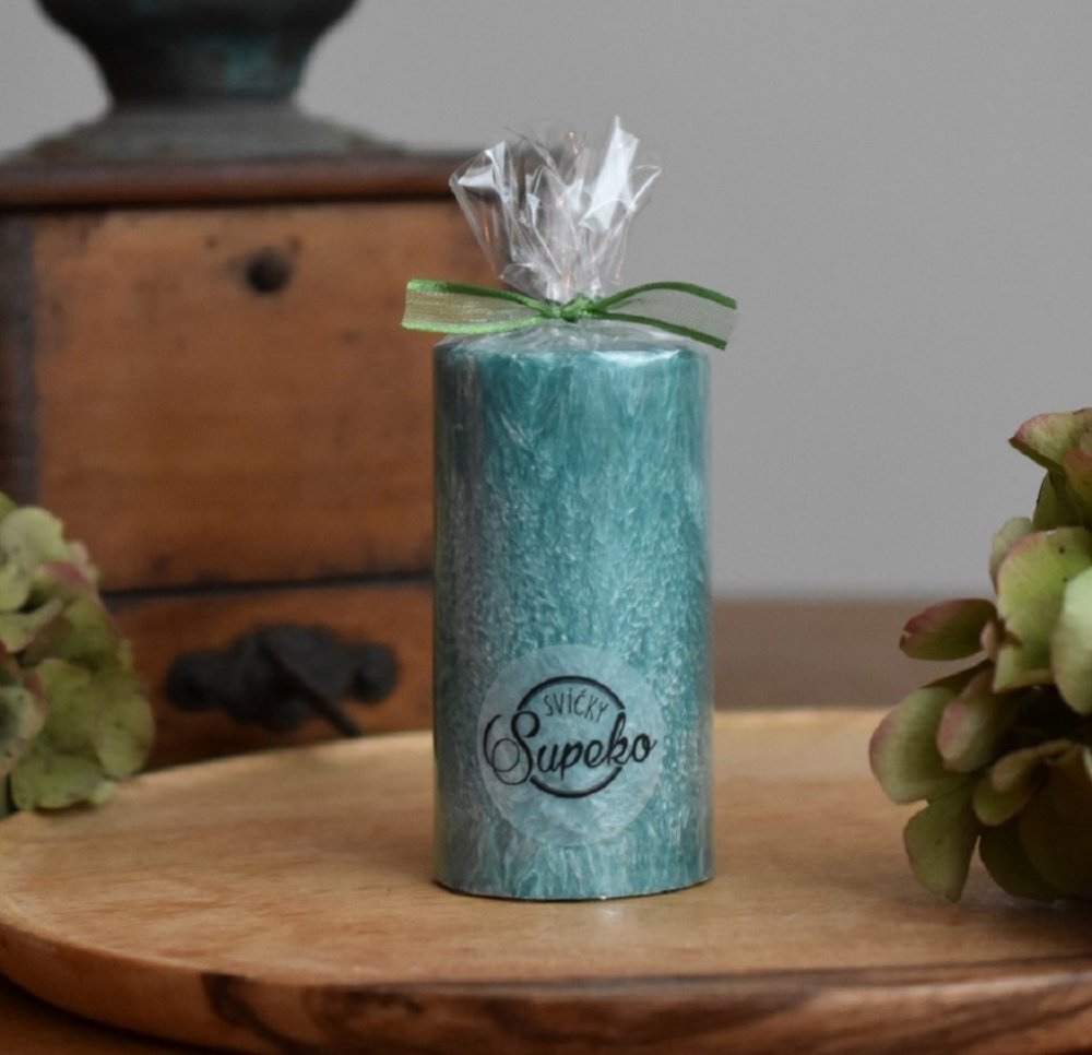 Svíčka, co má příběh. Od rozpuštění zrníček vosku procházela našima rukama až do své výsledné podoby a zabalení do balíčku. Každá je jedinečná, a to nejen díky "ledové" kresbě na povrchu.
