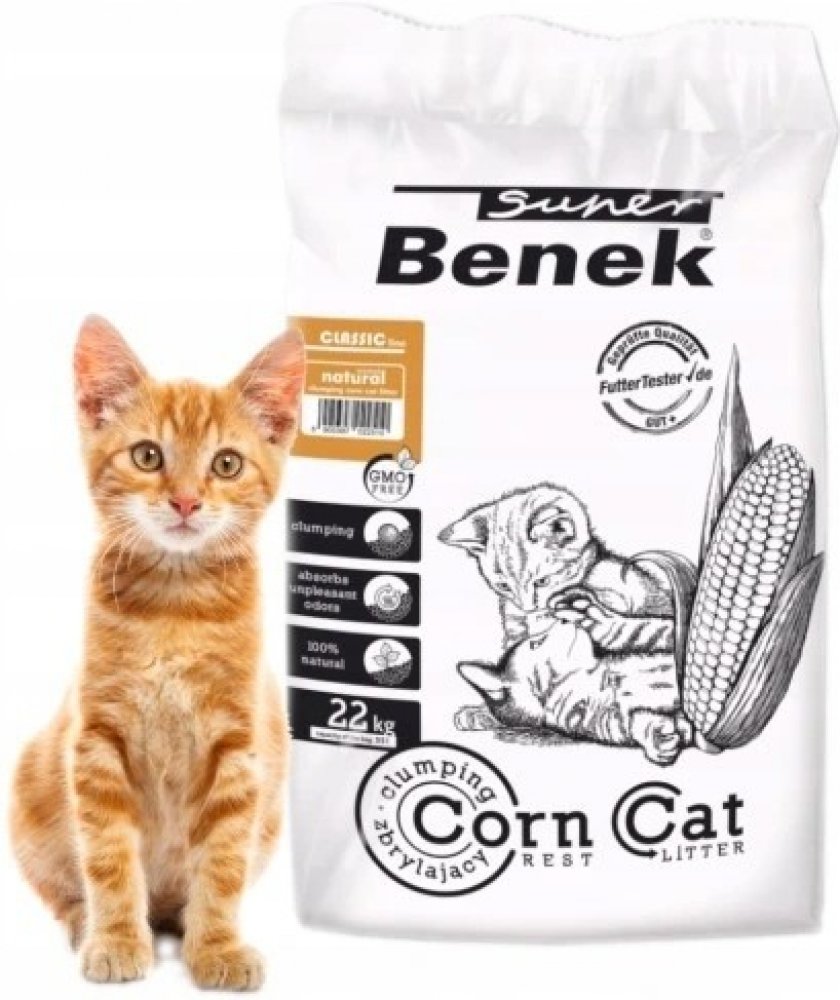 Podestýlka pro kočky Super Benek – KUKURYDNÍ, ZBRYLOVACÍ. Ideální substrát pro dospělé kočky a koťata, stejně jako pro králíky, hlodavce a ptáky.