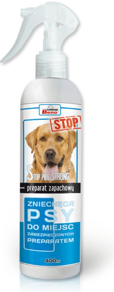 SUPER BENO silný sprej. STOP-PIES je přípravek nové generace, který odrazuje psy od míst, kde způsobují škody. Použitá vonná kompozice je založena na látkách vyvinutých s cílem účinně odradit psy od pobytu na pro ně nepovolených místech. V přípravku byla použita zvýšená koncentrace odrazujících látek pro zajištění co nejlepší ochrany míst a předmětů. Sprej lze používat v uzavřených i venkovních prostorách.Způsob užití:V případě, že je povrch znečištěn, je třeba před použitím přípravku odstranit nečistoty, výkaly a vyčistit znečištěný povrch. Lahvičku protřepejte a odemkněte rozprašovač. Nastříkejte přípravek na vybrané povrchy. Po použití prázdné balení odstraňte do odpadkového koše.Bezpečnostní opatření: Nevdechujte výpary. Dávejte pozor, aby se přípravek nedostal do potravin, kuchyňského náčiní ani na povrchy, které přicházejí do styku s potravinami. Vyhněte se kontaktu s skórą.Po použití si umyjte ruce. Uchovávejte v původním obalu. Chraňte před vysokými teplotami a mrazem. Uchovávejte mimo dosah dětí. Nepoužívejte přípravek přímo na rostliny.