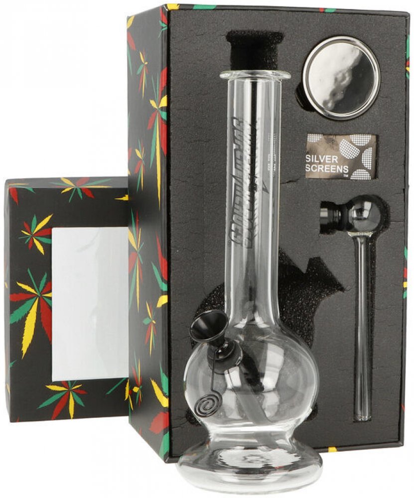 Dárkový set - skleněný bong se šlukovkou, drtičkou konopí a sítky. Praktická dárková sada Super Heroes Giftset Black obsahuje kuřácké potřeby, které nejednomu kuřákovi udělají radost. V sadě najdete malý skleněný bong z borosilikátového skla, dvoudílnou plastovou drtičku, skleněnou dýmku - šlukovku s odnímatelným kovovým kotlíkem a sítka. Vše je dodávané v dárkovém boxu.