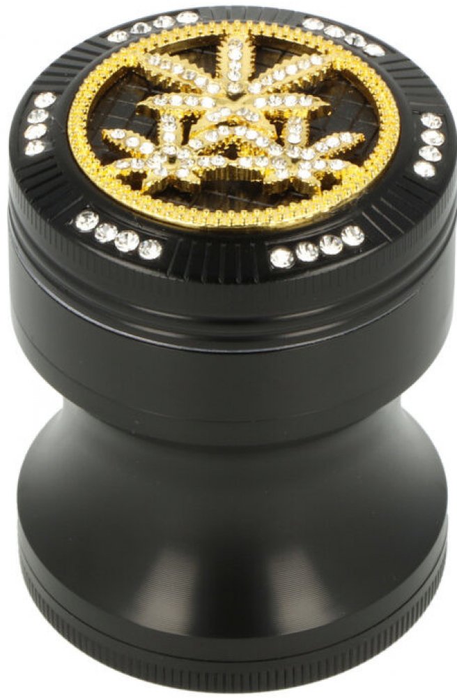 Kovový drtič tabáku Super Heroes Black Tower. Čtyřdílná drtička se závitem, sítkem a zásobníkem na tabák je vyrobena z hliníku CNC technologií. Drtič atraktivního tvaru v černém provedení má eloxovaný povrch s jemným drážkováním, díky kterému se dobře drží a neklouže v ruce. Ihned Vás zaujme horní stranou víčka, která je zdobená zlatým motivem konopného listu s broušenými kamínky. Jednotlivé díly drtičky na tabák jsou pevně spojené na závit, víčko je na magnet. Broušené ostří nožů ve tvaru diamantu velmi jemně nadrtí vaši směs do požadované hrubosti. Drtič na tabák je dodávaný v kartonové krabičce.