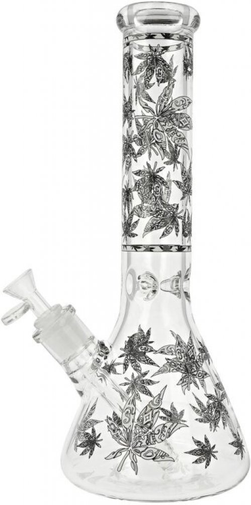 Skleněný bong Super Heroes Beaker Weed Leaves s Glow efektem. Transparentní bong oblíbeného tvaru Beaker je zdobený černobílými listy konopí, které díky efektu Glow in the Dark bong ve tmě rozzáří. Ice bong ukončený silným hrdlem je vybavený "výstupky" pro udržení kostek ledu k ochlazení kouře. Oproti standardním bongům je tento prémiový bong vyrobený z tepelně odolného borosilikátového skla tlouš...