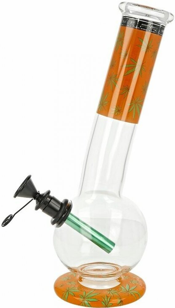 Zalomený bong Super Heroes Hemp Leaf Green. Skleněný bong v oranžovém tónu zdobený zelenými listy konopí a logem Super Heroes je ukončený středně silným hrdlem . Oproti standardním bongům je tento prémiový bong vyrobený z tepelně odolného borosilikátového skla tloušťky 3 mm. Kovový dvoudílný chillum je ukončený samostatným kotlíkem s držátkem a otvorem cca 3 mm.