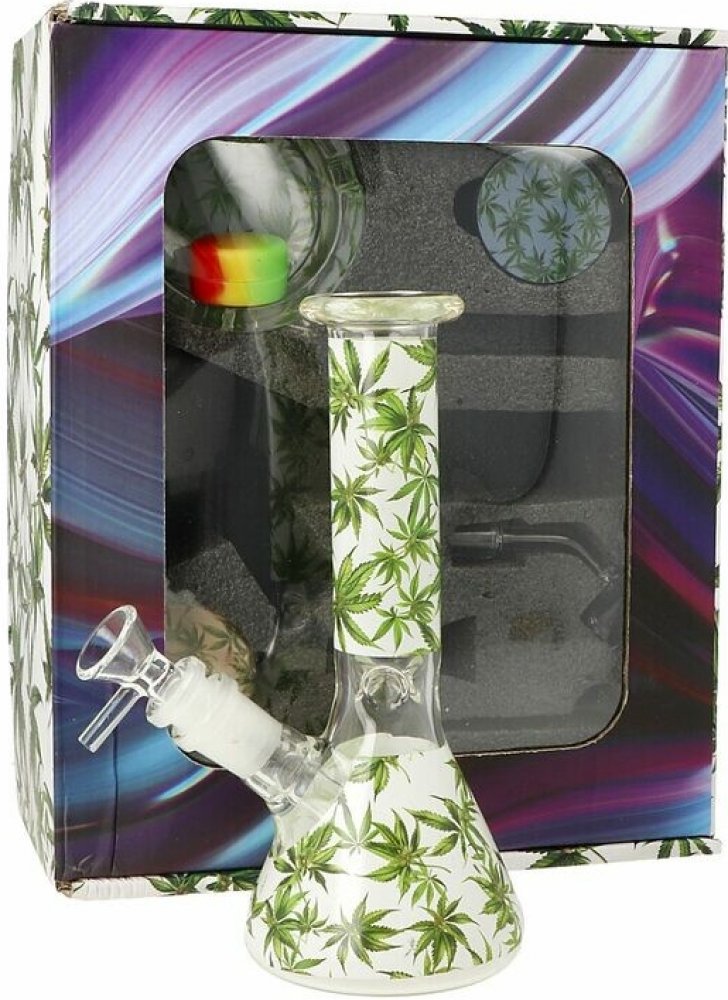 Dárková sada - skleněný bong zdobený konopnými listy v setu s kuřáckými potřebami. Dárkový set obsahuje ice bong s klasickým a olejovým kotlíkem, popelník, kovový tácek, schovku na byliny v pevném stavu a také na tekuté extrakty, čtyřdílnou drtičku, dabber na extrakty a čisticí kartáček. Díky přiloženému olejovému kotlíku je možné z toho bongu udělat olejový bong a kouřit z něho nejen byliny v pev...