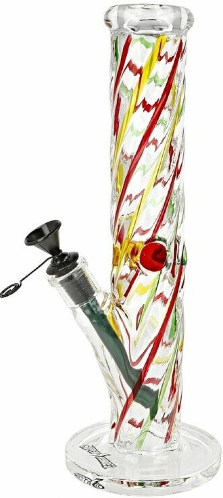Rovný bong Super Heroes Stripes. Skleněný bong s lehce krouceným povrchem je ve tříbarevném Rasta provedení. Ice bong ukončený silným hrdlem je vybavený "výstupky" pro udržení kostek ledu k ochlazení kouře. Kruhová základna o tloušťce 11 mm zajistí bongu skvělou stabilitu. Oproti standardním bongům je tento prémiový bong vyrobený z tepelně odolného borosilikátového skla tloušťky 6 mm. Kovový dvoud...