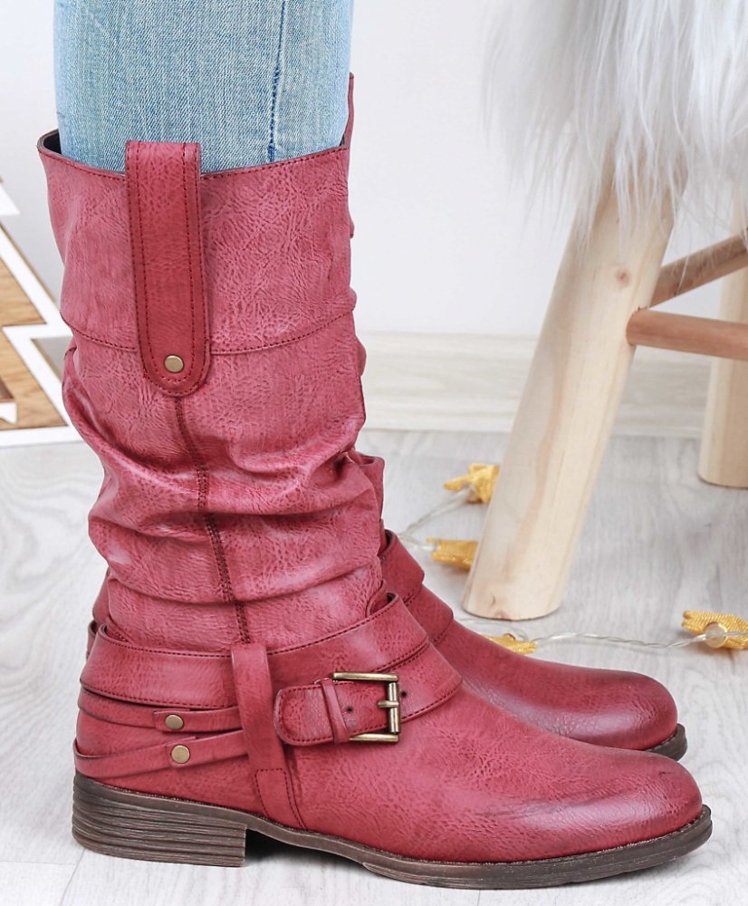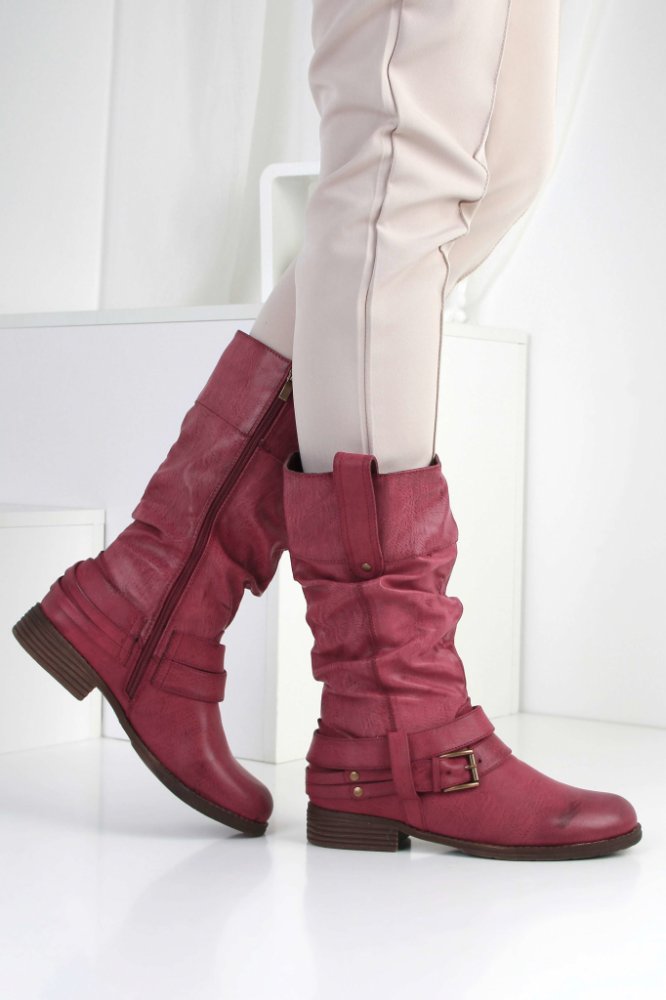 Kozačky v odstínu červené a vínové barvy mají krásnou patinu a tak je každá bota originál. Díky efektnímu ztmavení vepředu i vzadu na patě boty opticky zmenší nožky. Uvnitř najdete hrubý a světlý kožíšek, který zahřeje i při pořádných mrazech. Jemné nařasení materiálu vypadá atraktivně. Tyto zimní dámské kozačky budou ozdobou vašich zimních outifů.