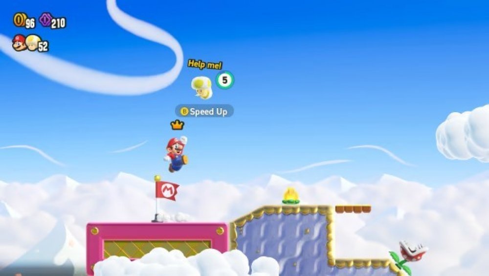 Tradiční z boku viděná Mario hratelnost se promění s přidáním zázračných květin (Wonder Flowers)! Tyto herní předměty spustí dosud neviděné momenty, které musíte vidět na vlastní oči, abyste jim uvěřili. Čekají na vás oživlé trubky či ostnaté míče způsobující spoušť všude okolo vás. Ty nejvíc neočekávané okamžiky se však jmen...