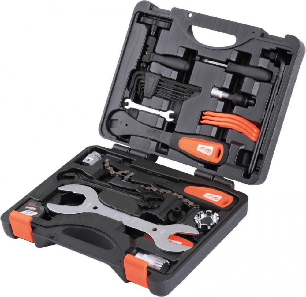 Sada nářadí 25ks. 25-ti dílná sada nářadí HOBBY SuperB TBA600 Obsah: Kónusové klíče 13,14,15,17 mm Nýtovač Křížový šroubovák Imbus 2-6mm, 8mm Klíč 8/10mm Stahovák na kliky Klíč na středy ISIS Samolepící záplaty Pedálový klíč 15mm Centrovací klíč Stahovák na kazety Bič na kazety