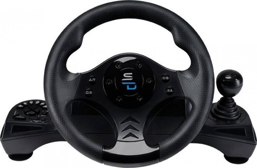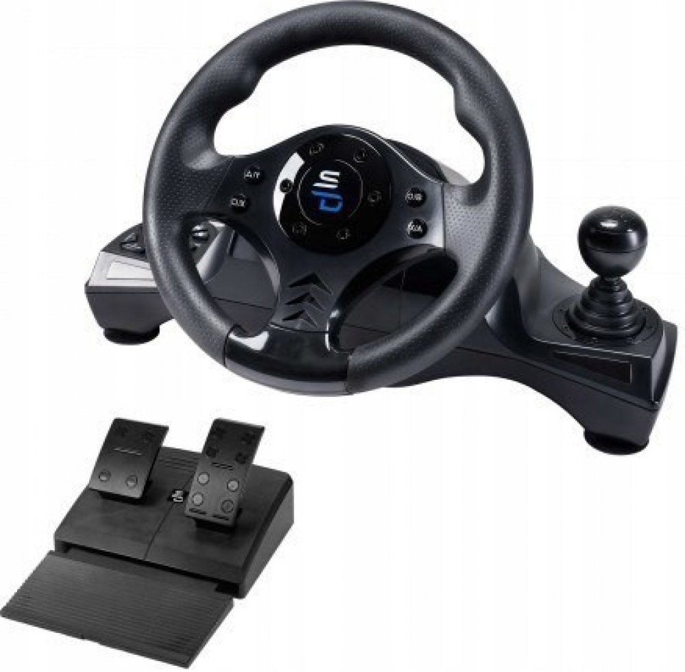 Set SUPERDRIVE GS750 obsahuje vše pro komplexní řízení virtuálního vozu. Tato sada obsahuje volant, pedály a řadicí páku, abyste dosáhli maximálně autentického zážitku ze řízení vozu. Volant disponuje 270° úhly otáčení, díky čemuž se přizpůsobí každému jízdnímu stylu. Nezáleží na tom, jestli jedete střídmě a na jistotu, nebo se snažíte prchnout před policií. Nastavitelné úrovně citlivosti vám umožní hrát v arkádovém stylu i v plné simulaci. Základna je na spodní straně vybavena přísavkami, díky čemuž volant s řadicí pákou pevně drží na svém místě.